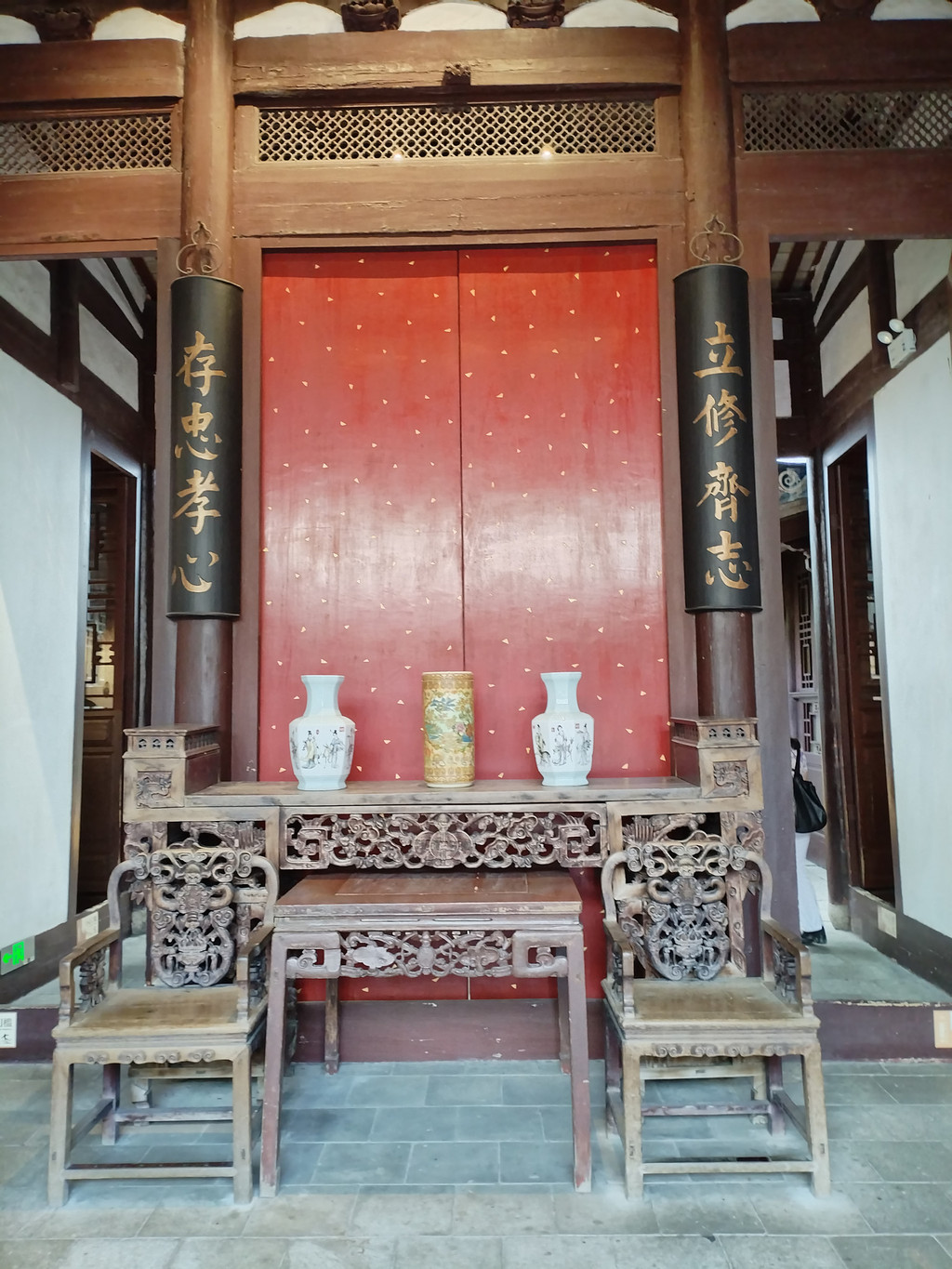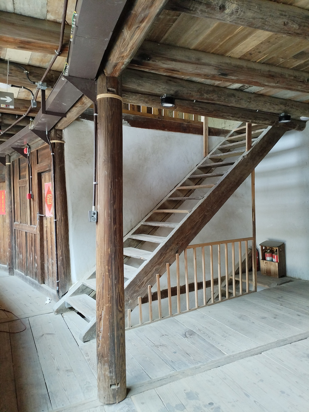 和贵楼是主楼,它的前面还建有低矮的小土楼挡住了它——这个小土楼叫护厝,过去常用作厨房、杂物间、客房,属于辅助空间。和贵楼内,层层房间主要是用木材建成;屋子四角有木梯,可以由此上楼。天井中除了有两口水井,中间还有座一层高的方形小土楼,只有三间,里面也有天井——这是他们的祖堂和私塾。可以说,和贵楼,楼外有楼,楼内也有楼。
