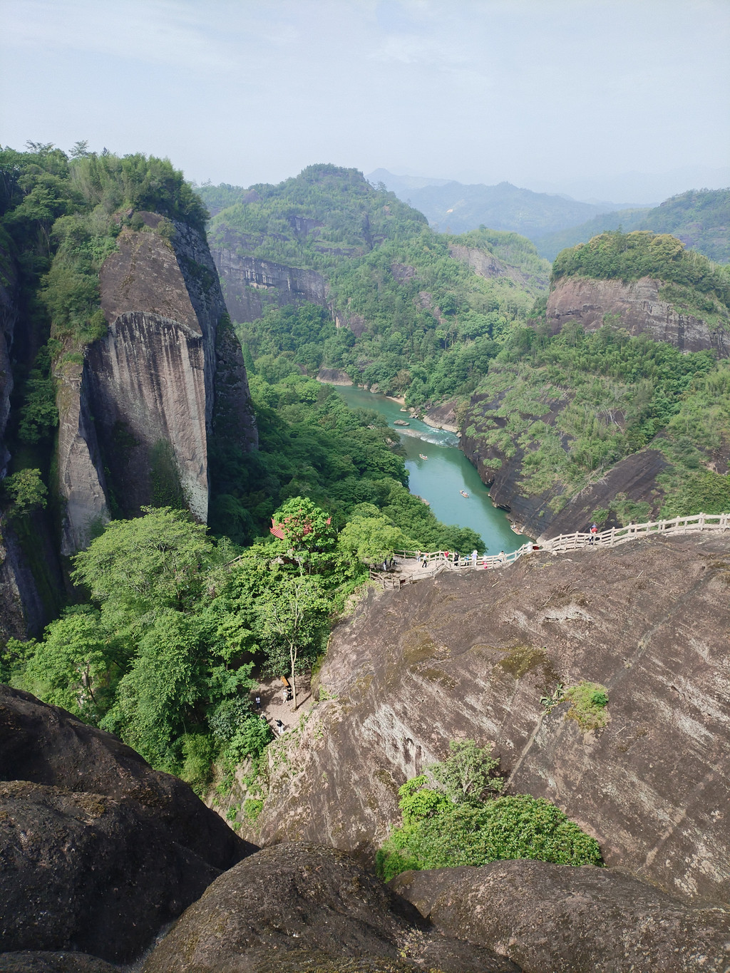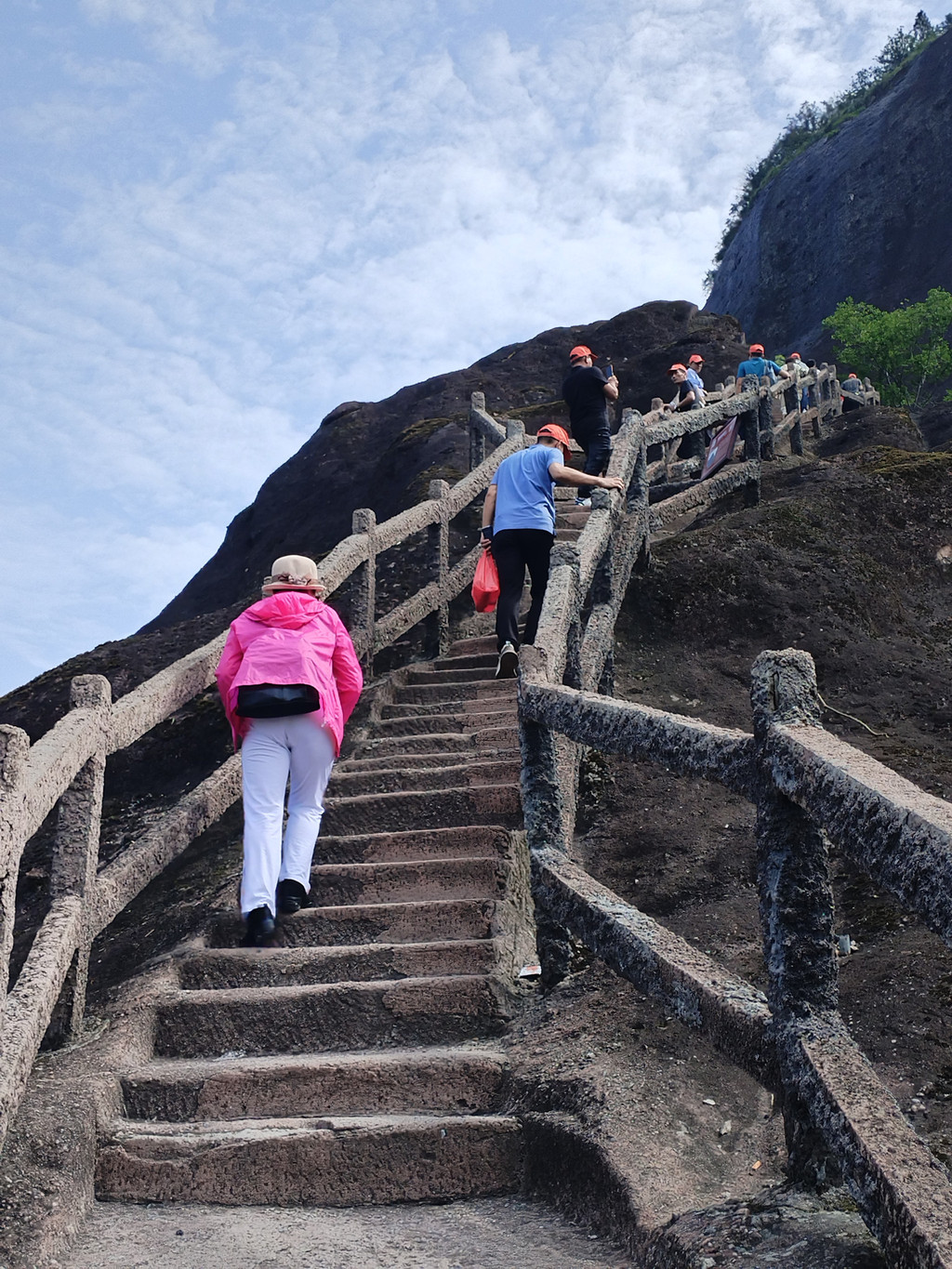 阿李和旅游搭子结伴攀登了天游峰。那天,红日高悬,天蓝云白,没有云雾遮挡我们的视线,武夷山毫无保留地向我们展开了它的山水画卷。我们从天游峰山脚一直爬到山顶,充分体验了天游峰的陡峭险峻:因为道路狭窄,上山的路是单行线,只上不下;过了半山亭,天游梯的八百四十八个窄窄的石阶只能靠自己一步一步攀爬上去;必须经过光溜溜的红褐色的鲫鱼背,两侧是深达百米以上的陡峭山崖和幽深峡谷,并且非常狭窄,最窄处只有一米左右;接近峰顶的最陡一段路坡度近乎七十度,前面游人的脚下就是后面游人的头顶。好在不管登山之路多么险峻,路旁都有坚固的护栏。阿李手扶栏杆奋力前行,终于成功登顶——尽管汗水湿透了衣裳。