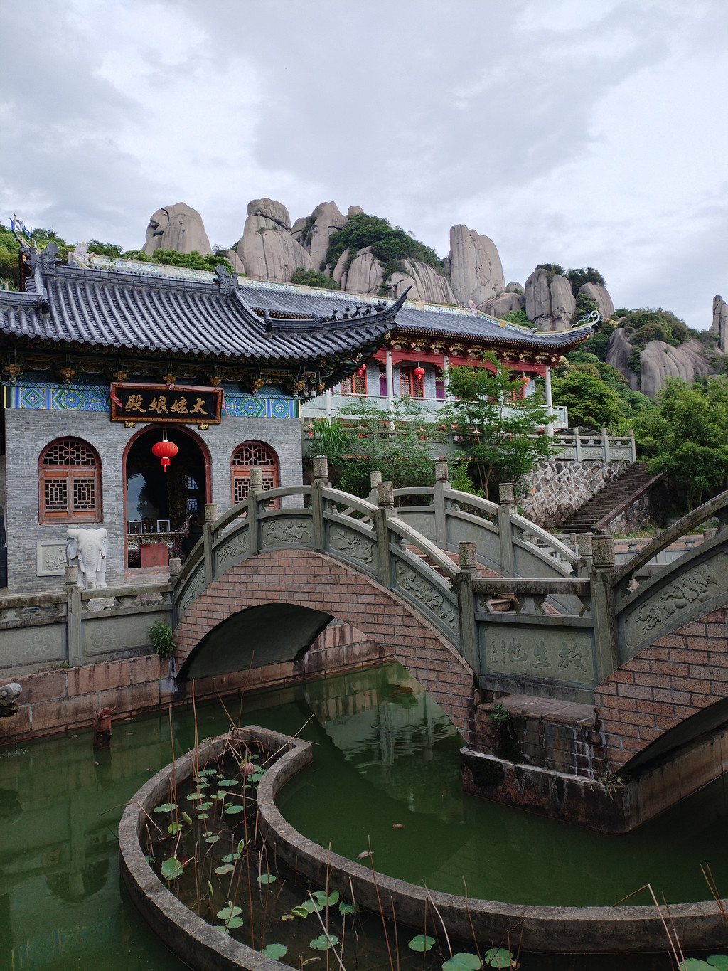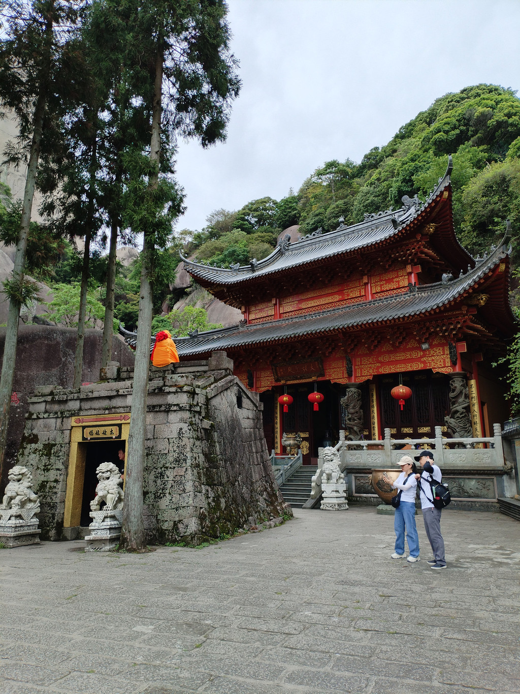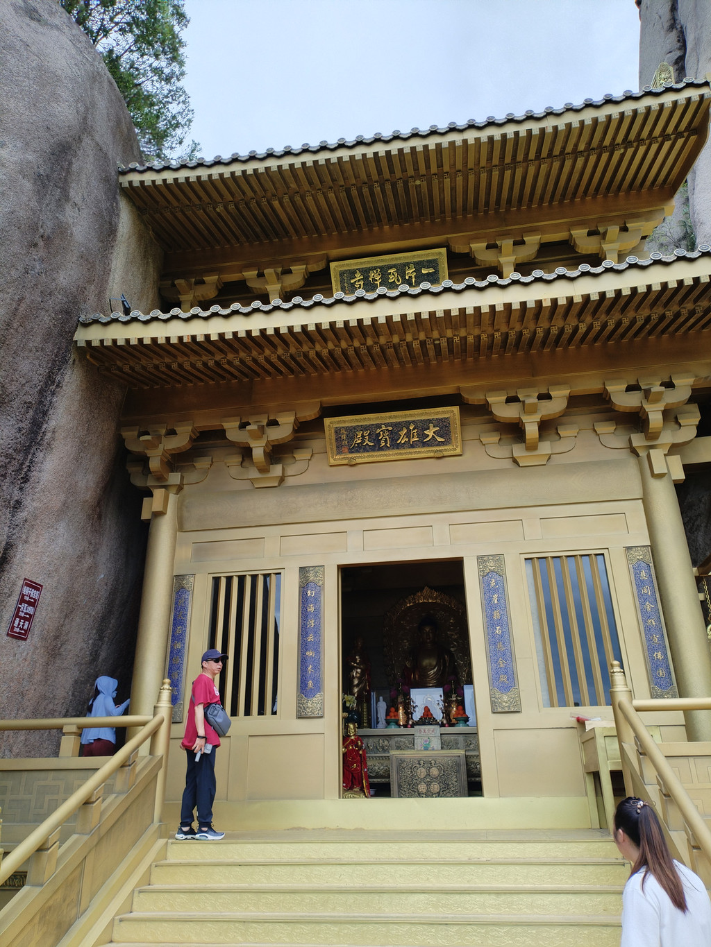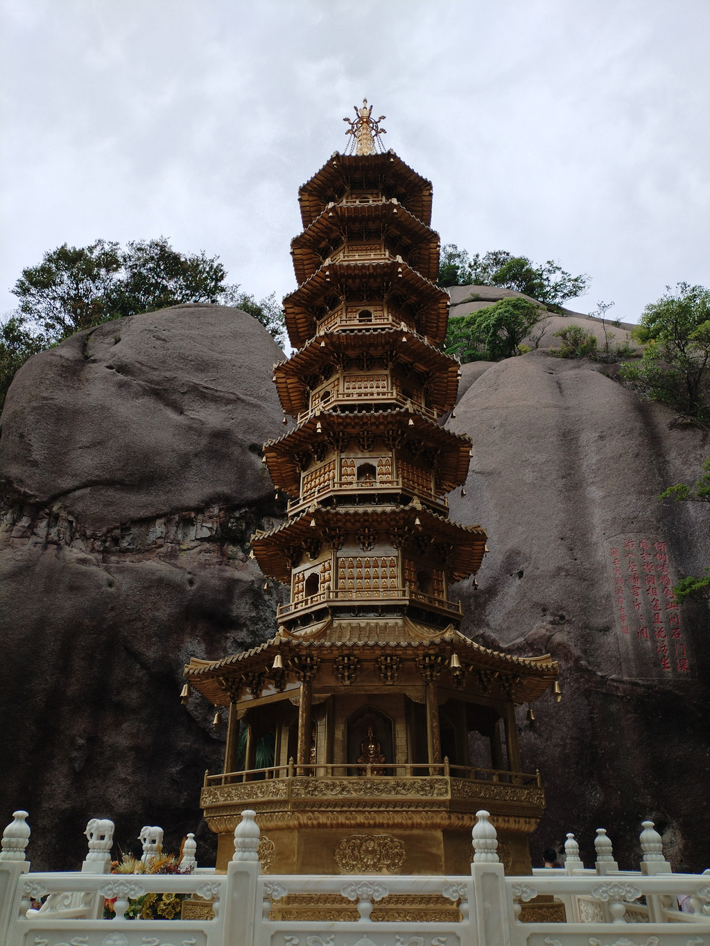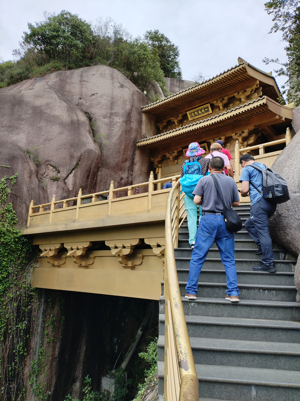 阿李认为,太姥山中最奇特的建筑应该是一片瓦禅寺的大雄宝殿。一片瓦禅寺本身就很奇特:它始建于明朝万历年间,位于太姥山九鲤朝天峰附近一岩洞里,一块巨大的岩石像瓦一样盖住了它,因此得名“一片瓦禅寺”。而它的大雄宝殿更是奇特:它是我国首座、全球唯一的悬空铜殿,纯铜铸造,用铜一百五十多吨;建造时间长达十年——2001年初开建,2011年底建成;大雄宝殿背靠九鲤朝天峰,左靠升天石,右邻莲花峰,下方为深谷,前眺东海,浮空而立。整座建筑在太姥山悬崖峭壁的衬托下,显得格外庄严肃穆。