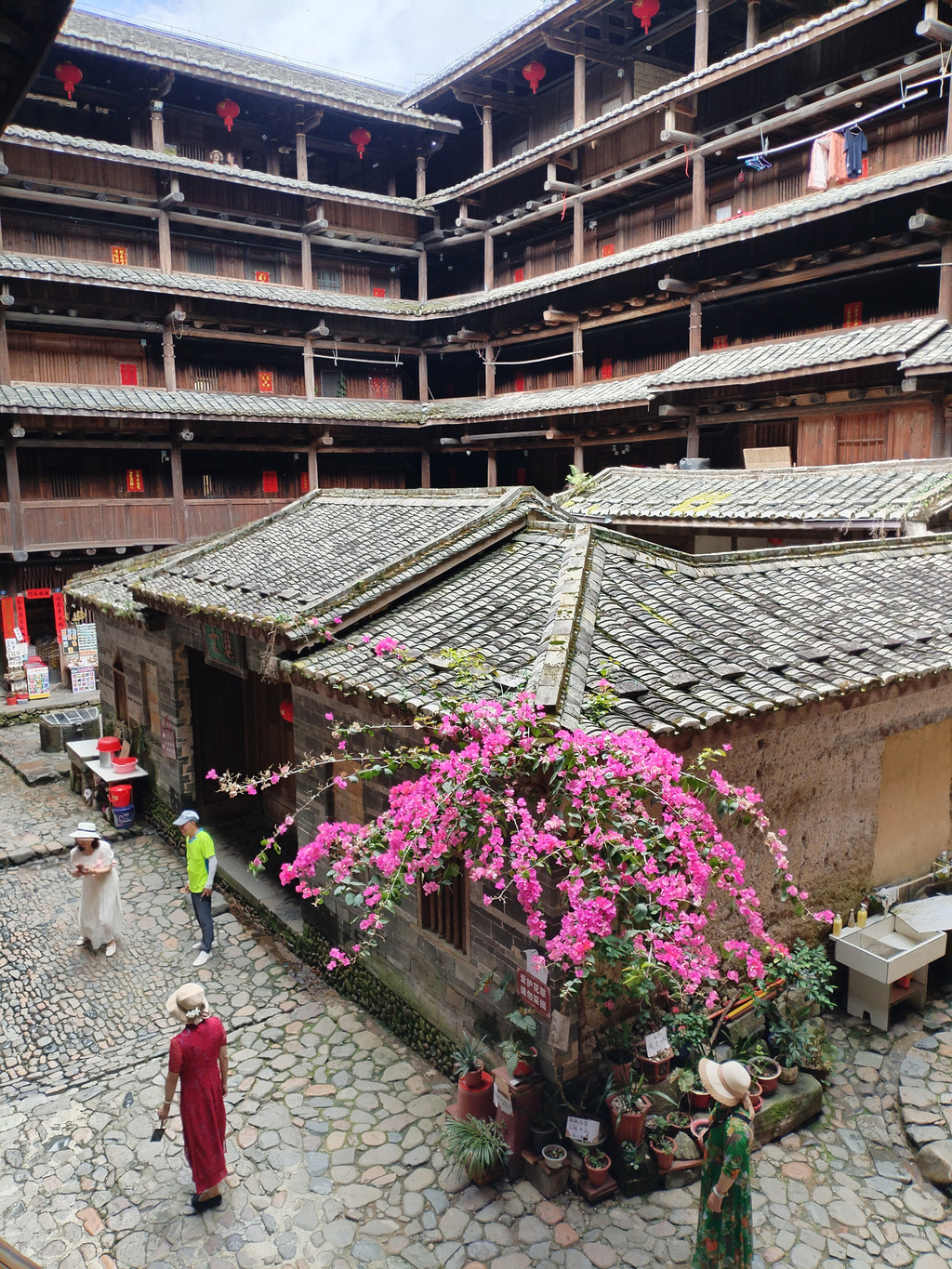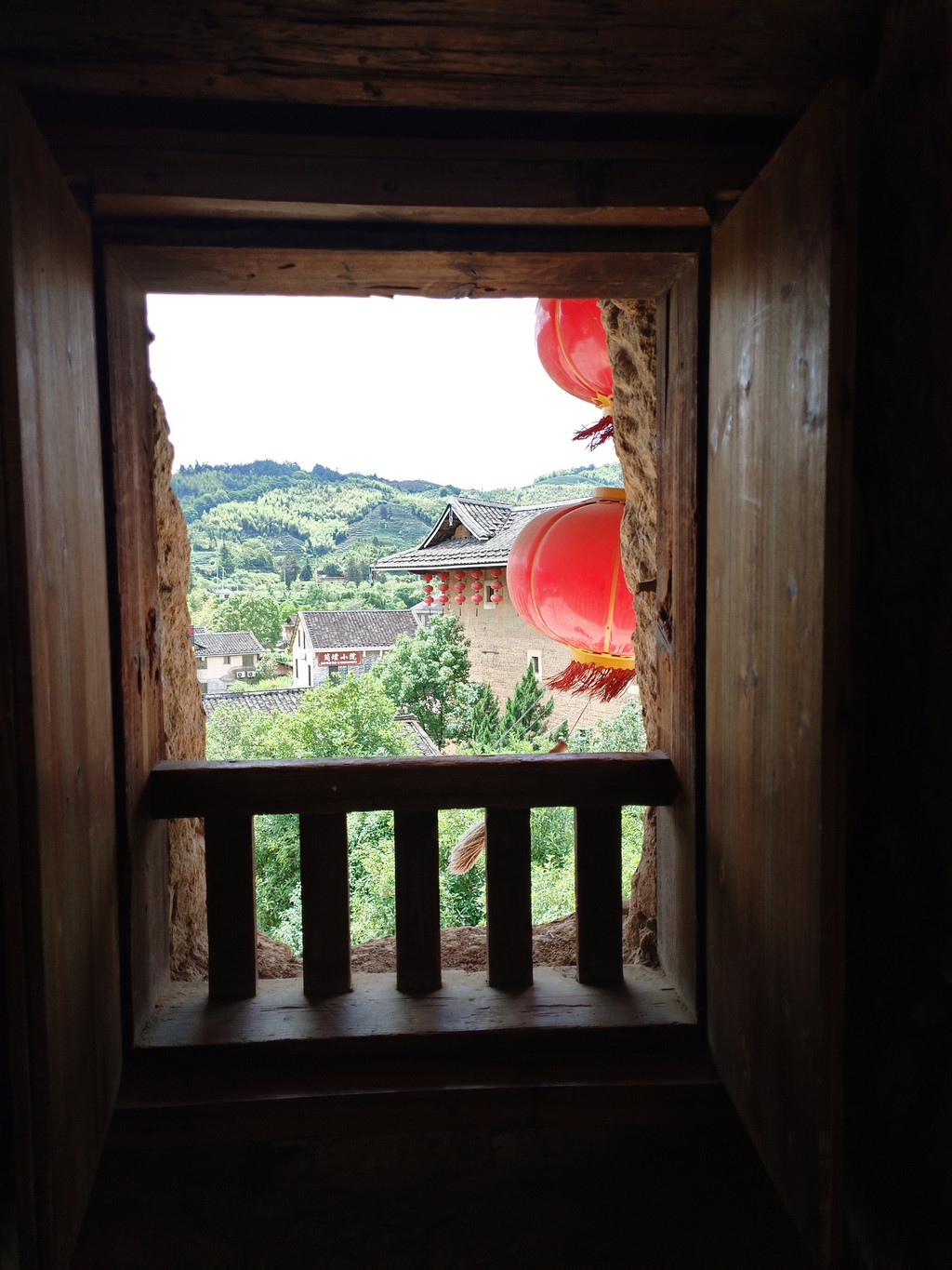 阿李早就听说过福建土楼,也看过很多土楼照片,但这次亲眼看到时,还是禁不住对土楼的精妙设计连连称奇。更让阿李惊奇的是,和贵楼竟然建在沼泽地上,历经两百九十多年和数次地震,没有倒塌,也没有下沉。阿李从一楼上到五楼,在每层的环形走廊上走了一圈,感受到了和贵楼厚重的历史感。从三楼到五楼,走廊外都有伸出去的屋檐——屋檐可以防雨防晒,还可以晾晒物品。从上往下看,四层屋檐整齐有序。阿李在五楼时,还特意看了一间房的窗户:窗不大,外面挂着红灯笼,可以看到土楼后面的绿树青山。而窗户墙壁的厚度让阿李再次惊讶:黄土筑成的墙壁差不多有一米厚!可以想象一楼的墙壁厚度是多少——一楼墙壁以石块为主要材料,一楼以上的墙壁以黄土为主要材料,墙壁厚度由下向上递减。难怪土楼还有防匪防盗防火防水的作用。