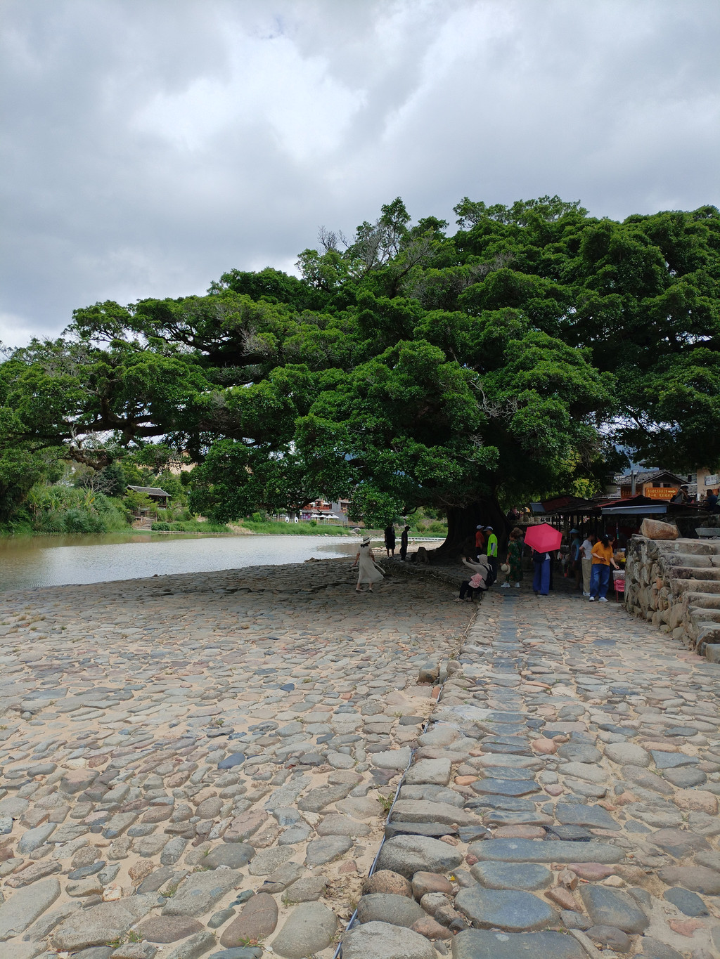 我们来到白水洋边,一片白花花的宽阔水面铺开在我们眼前,颇为壮观——这也是白水洋得名由来。虽然景区售卖门票时给我们每人发了一双白袜,让我们下水时套在脚上防滑,而且当时雨也停了,但因为那天温度较低,基本上没有人脱鞋入水。大家只在溪边用手玩玩水,然后拍拍照。只有一位团友从浅水广场往上游走,走过双龙桥,到了对岸;在对岸,他沿着步道走到浅水广场,然后脱掉鞋,蹚水回到我们这边。他证实:水确实不深,水底确实平坦没有沙石,走起来也不打滑。阿李由此想象:夏天时,白水洋浅水广场里该有多少游人啊!那时的戏水场面该有多热闹啊!
