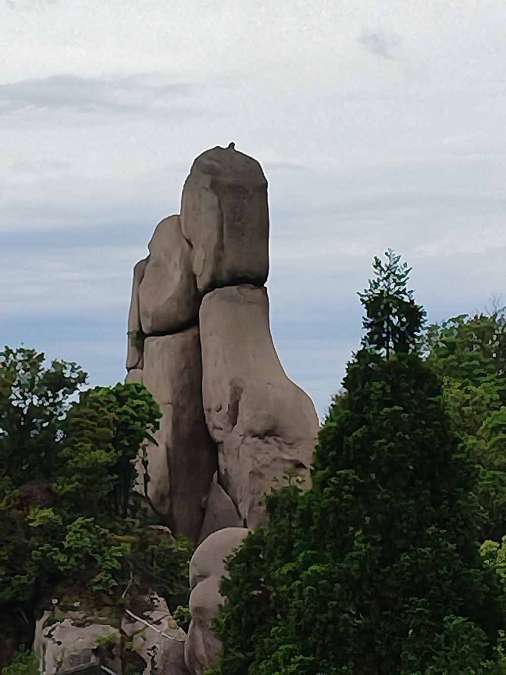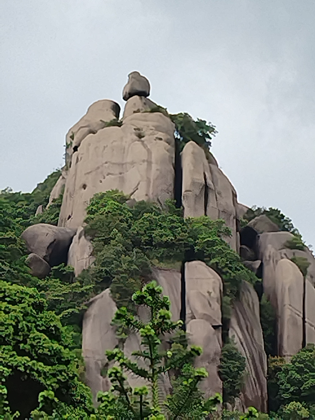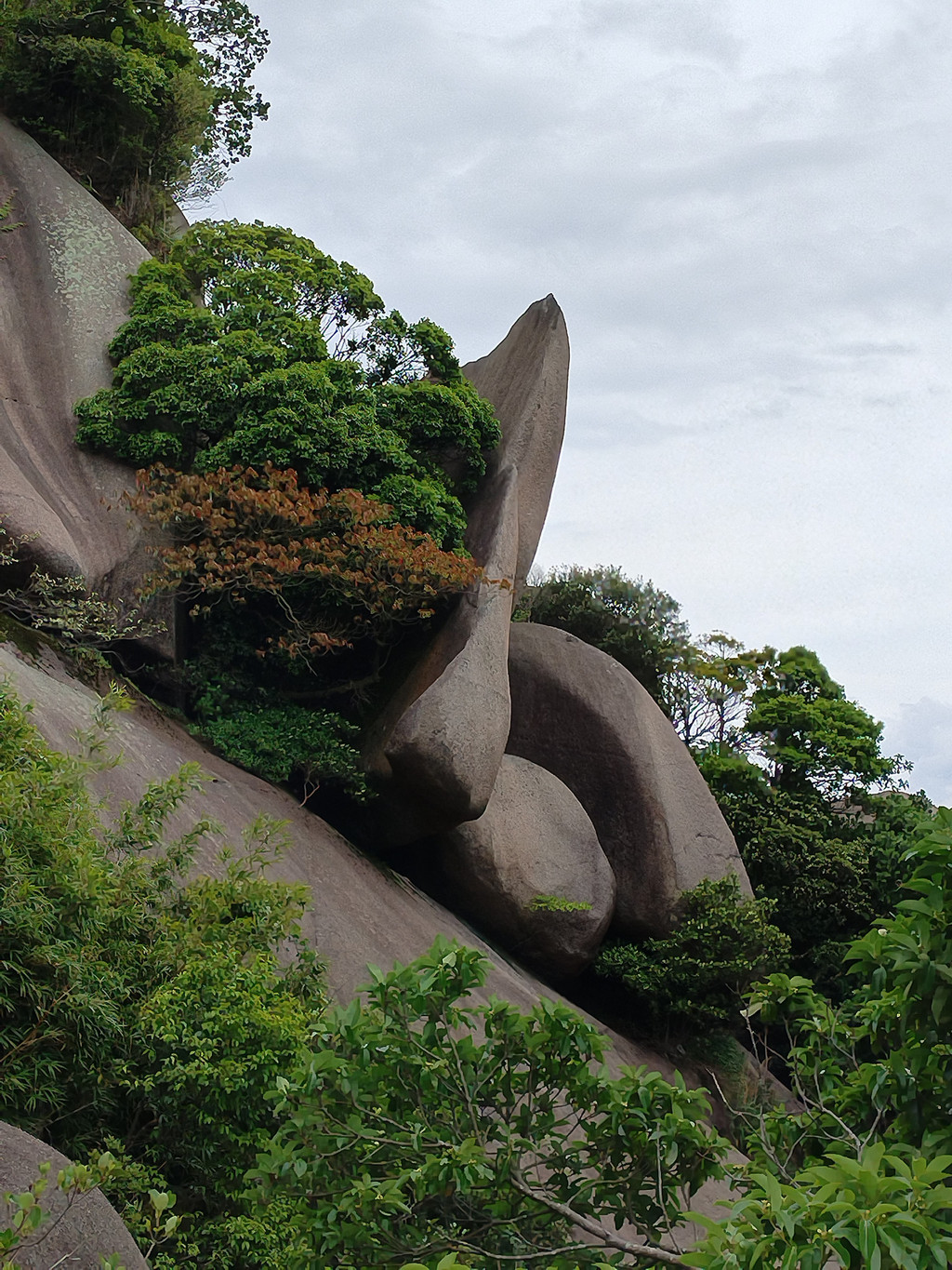 阿李认为,太姥山中最经典的花岗岩肖形景观应该是夫妻峰。我们乘坐景区交通车到达的第一站就是用夫妻峰命名的:夫妻峰广场。我们在夫妻峰广场下车,开始登山。山顶上有无数个光溜溜的巨大岩石,夫妻峰就是其中一个。阿李初次看时,在那一大组岩石里没找出它,后来看了路旁景点介绍牌就很快认出了,而且越看越像——太姥山景点介绍牌不仅有文字,还有照片。夫妻峰并不是群石里最高的,但它是最形象的:它由两块石头组成,一高一矮,中间有一条细缝,形似一对夫妻相拥在一起。至于我们途中遇到的迎客峰、仙翁对弈、金猫扑鼠、仙人锯板、仙掌岩、金龟爬壁、笔架峰等等,如果不看路旁的景点介绍和照片,不进行充分想象,就很难认同它们的名字。