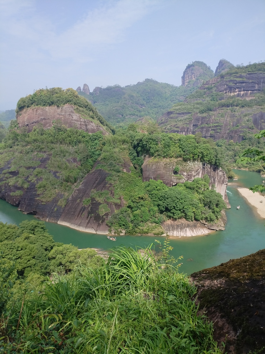 我们福建游的第一站就是武夷山。武夷山在福建省西北部,地处福建和江西交界处。武夷山是丹霞地貌,享有碧水丹山的美誉。碧水主要是指九曲溪,它蜿蜒曲折,似一根绿色绸带绕着一座又一座奇峰险岩,溪水上的竹筏载着游客顺流而下。碧水,竹筏,山崖,构成武夷山中一幅绝美的山水画。
