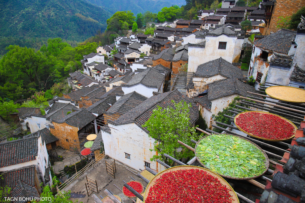 说到婺源篁岭最出名的莫过于晒秋景象了,晒秋是一种典型的农俗现象,具有地域特色。在江西等地生活在山区的村民,由于地势复杂,村庄平地极少,只好利用房前屋后及自家窗台屋顶架晒、挂晒农作物,久而久之就演变成一种传统农俗现象。这种村民晾晒农作物的特殊生活方式和场景,逐步成了画家、摄影家创作的素材,并塑造出“晒秋”称呼。其实晾晒这种农俗现象,并非秋季“专属”,一年四季都有展示。就这次前几天我去到篁岭依旧能看到晒秋的景象。