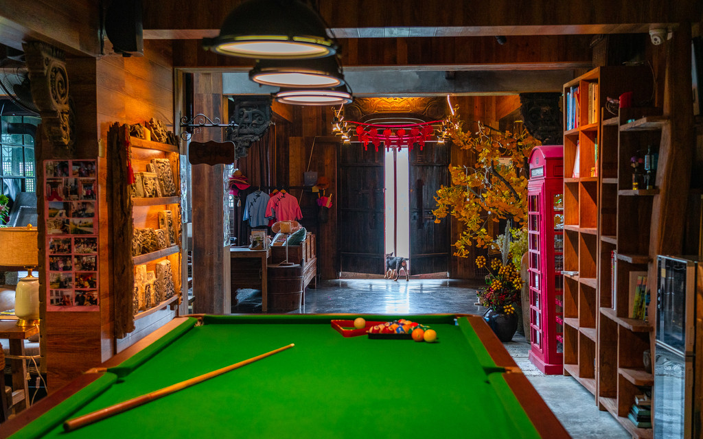 我到花田溪的时候,正好是婺源的雨季,空气中弥漫着蒸人的水汽,加上民宿的周边,全是水稻田,就更加觉得湿润了。不过走进民宿,反而有种清凉的感觉,大概乡里的老房子,都会有这种感觉。花田溪的大堂有数百平米,被分隔成不同的休息区域,客人可以坐下来喝茶,可以在书架上找本书阅读,也可以玩一把桌球,当然还能欣赏一下主人精心栽培的盆景。