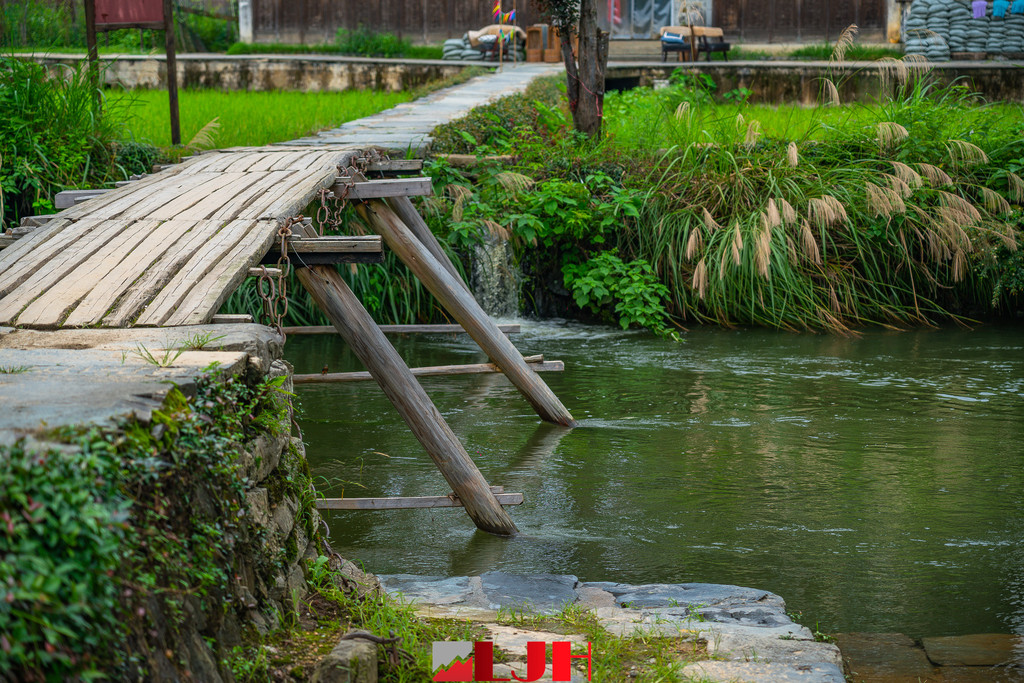 据说,花田溪的前身,原本是村里人一家宗祠建筑,破旧了。热衷民宿的外地人,看中了这处破败的房子,于是问原主人租下来,爆改成现在的民宿,这个在婺源的乡村旅游点都能见到。民宿的正门正好面对思溪村的老村落,一条在稻田里的乡间小径,通过架设在清溪河上的木板桥,与村子相通。而民宿的后背,是乡村公路,游客投宿,需把车辆停在路边的停车场,然后沿石块垒出来的小路下行,才能抵达花田溪。
