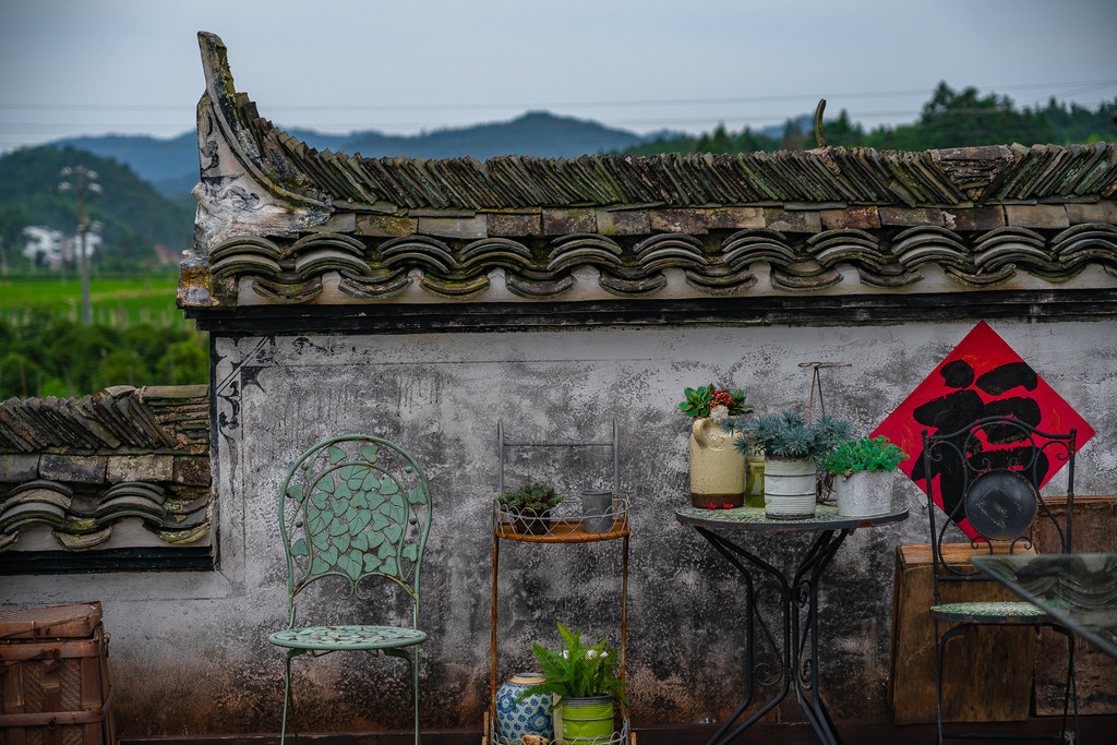 花田溪的民宿不算大,分前后两栋,前一栋为二层楼结构,带有一个五六十平米的露台,露台上摆满了各类盆景。后一栋为三层楼结构,边上有木楼梯直通。住前一栋客房的,可以面对民宿前的水稻田,以及隔河相望的古村落;住后一栋的,只能在房间门口的过道里,才能细看外边的风景。