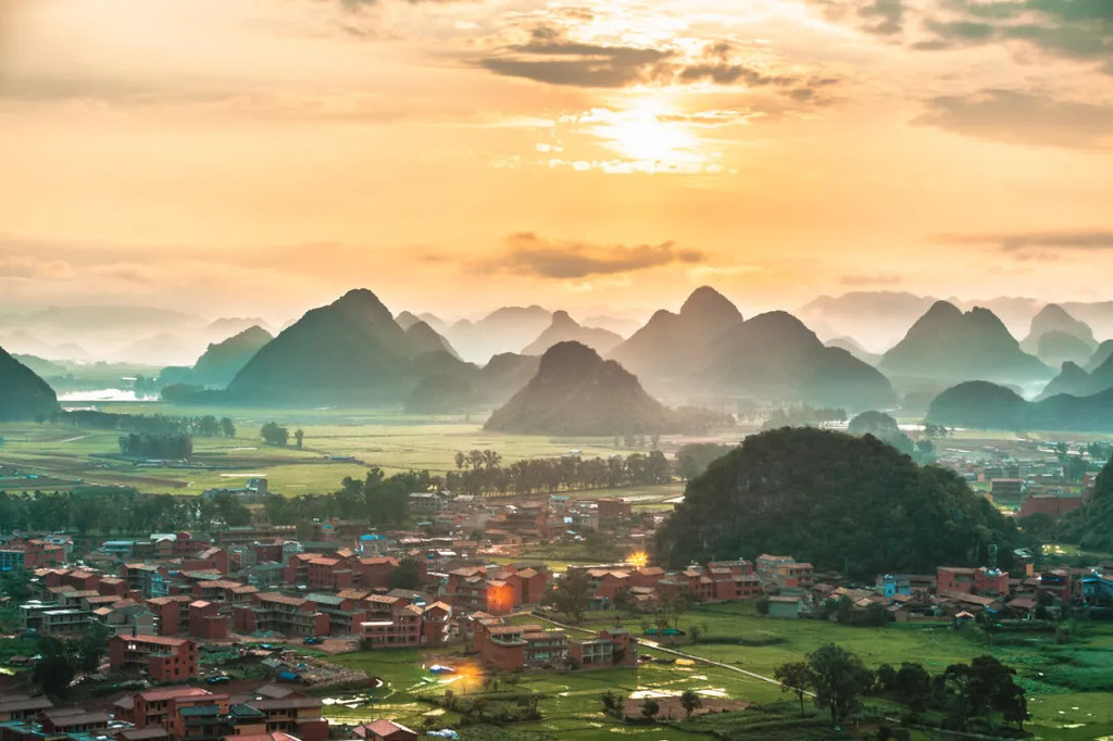 到了秋天,夕阳摇曳着金色,山峦被夕阳给吞噬,远方云雾渺茫,就像是被一幅上了色的水墨画。