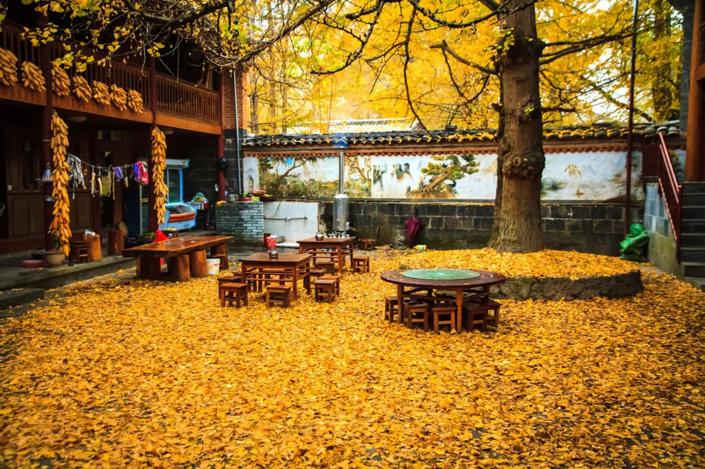 一入秋,村子就会被两千多亩连片栽种的银杏树染成金黄色,地上也被银杏叶铺满,就像是金色的地毯,风景绝美。