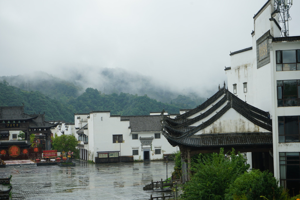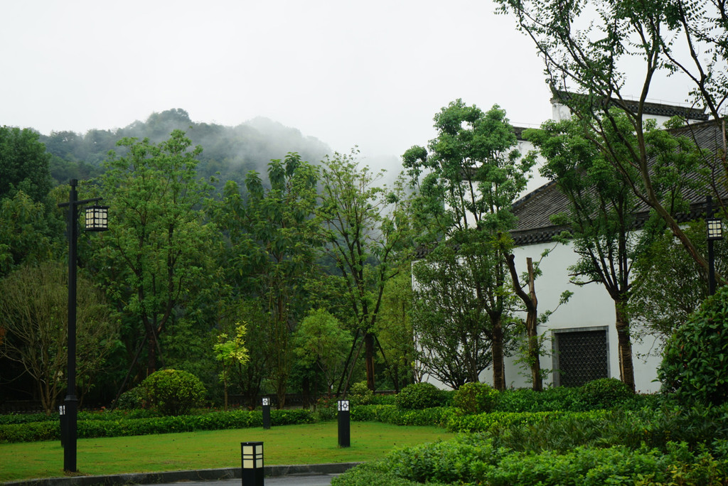 白墙黑瓦,一阵细雨之后,在酒店门口便看到了云雾缭绕之仙境,对于一个从城市里来的人,这般景色不出酒店便能领略,着实有种莫名的幸福感。