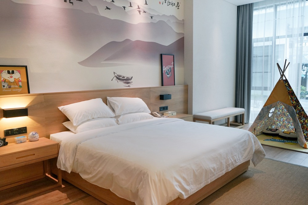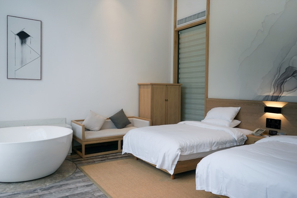 两侧则对称分布了各类客房,69间客房各具韵味,江景房、星空别墅(木屋)、四合院、亲子房(双层)等13种房型,最大房间面积达到138平米,平均面积在55至70余平米之间,宽敞,禅意...
