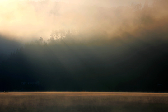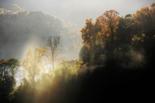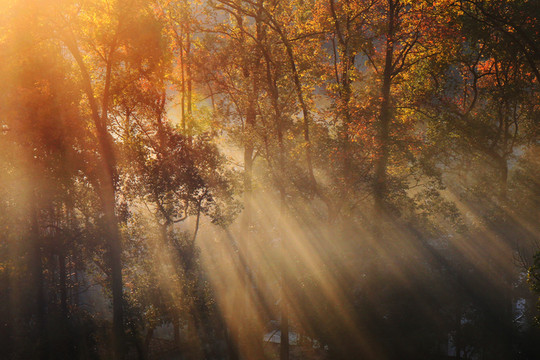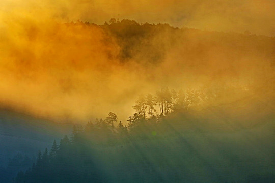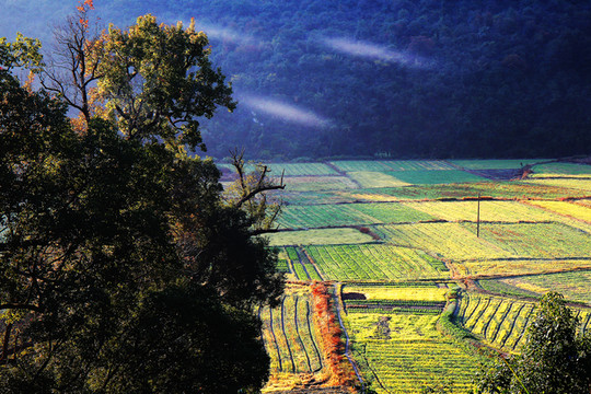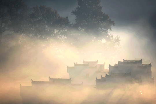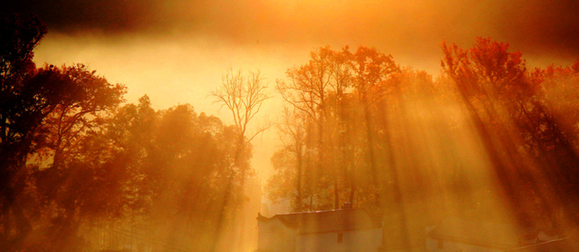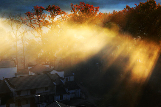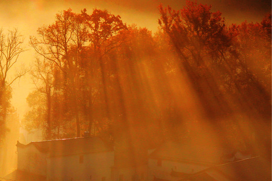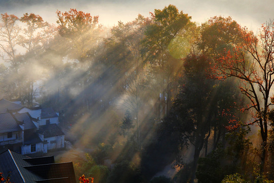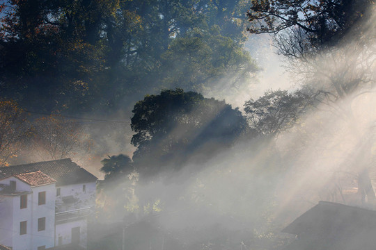 对冲是近几年才火爆起来的摄影地,也是难得既可以拍摄日出又可以拍摄日落的拍摄点,整个村庄被上百棵大树包围,由于地处开阔的峡谷平地,比石城程村窝在山坳里有利于烟气扩散对流,因此这里是拍摄丁达尔光的理想场所。