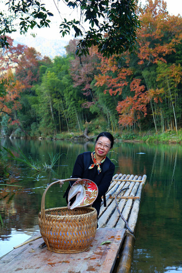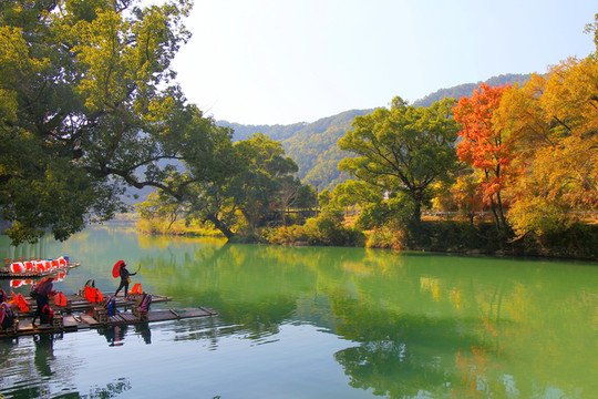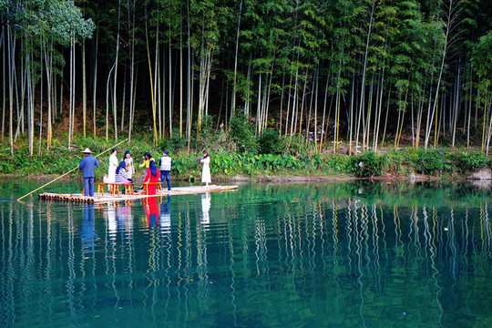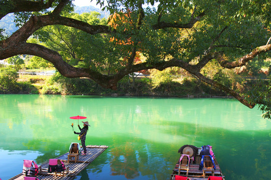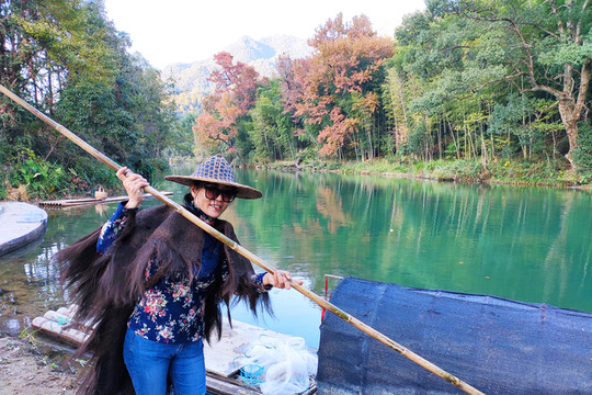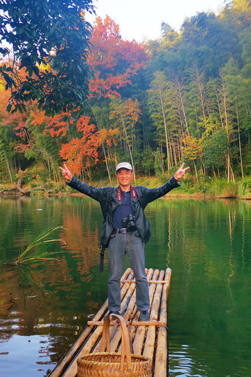 河里有游客乘坐竹筏游玩,鲜艳的穿着正好为我们做了回免费的模特。