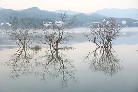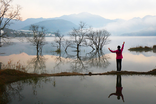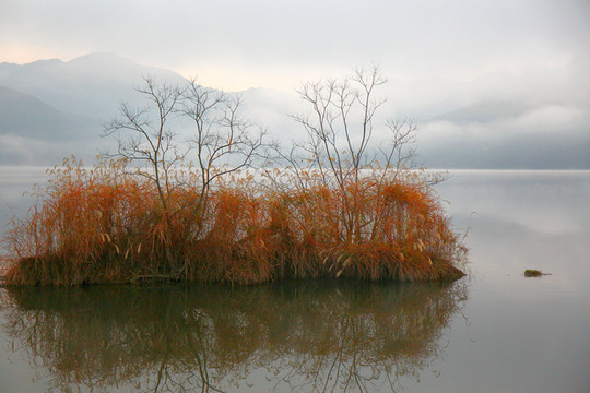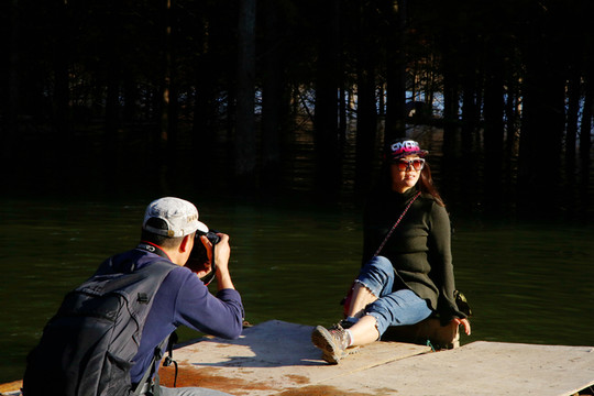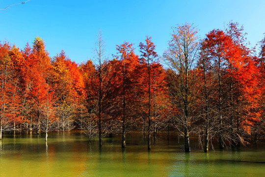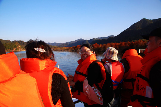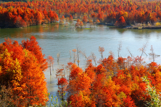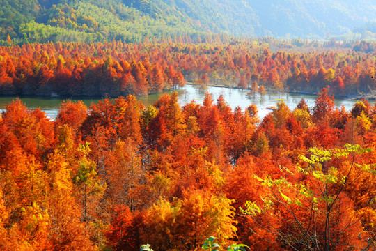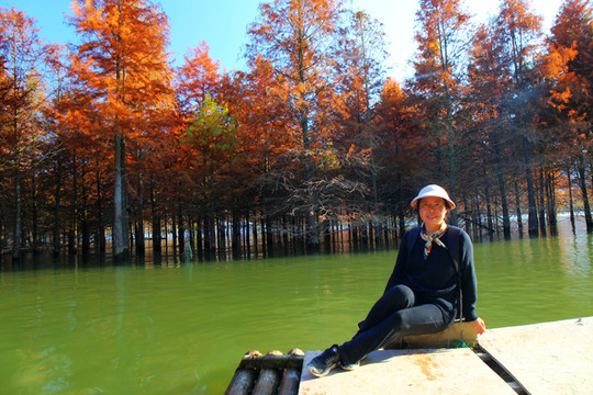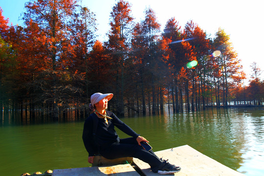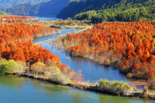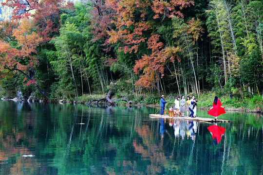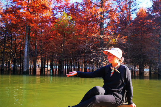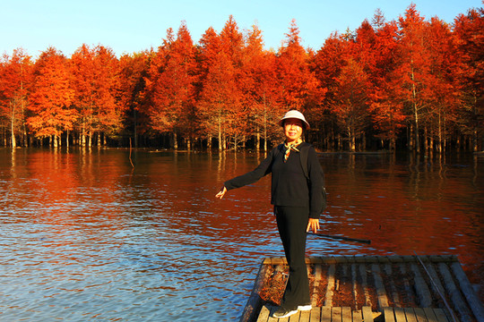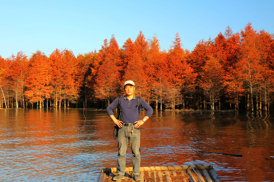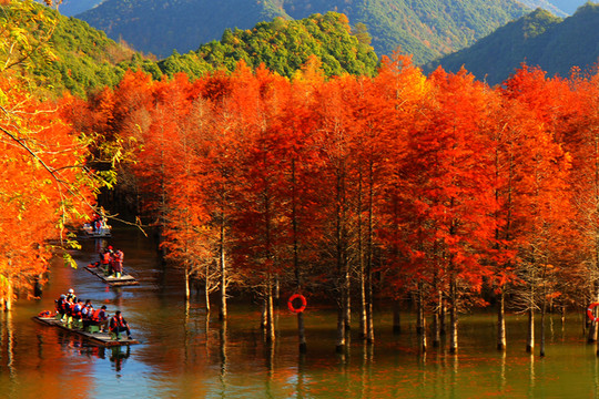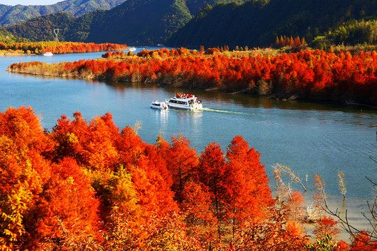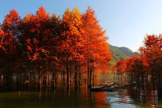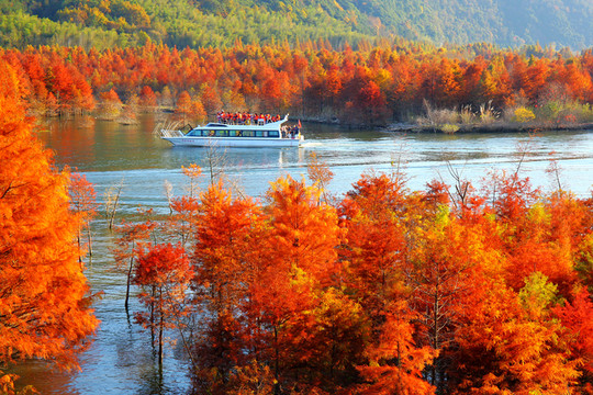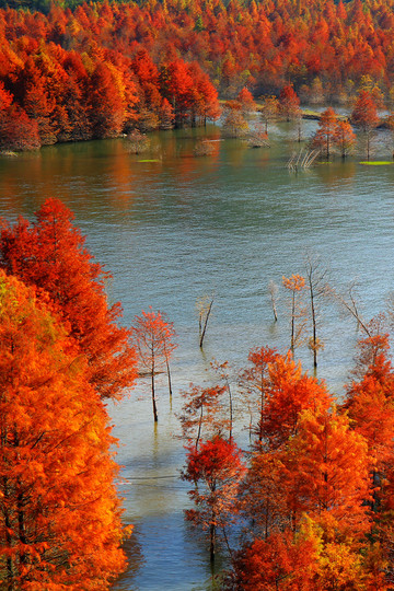 这里被誉为安徽的水上喀纳斯,火红的千亩水杉密集整齐地生在水中,与宽广碧绿的水面相互映衬,红杉林倒映在清澈明净的水面上,更是美得不可思议,恍如北疆的喀纳斯风光。