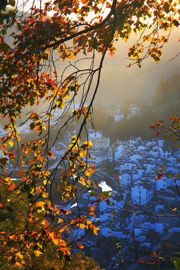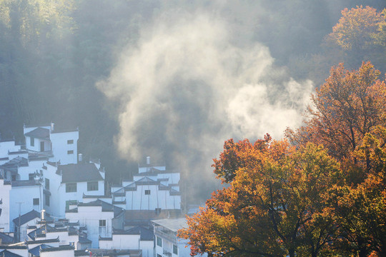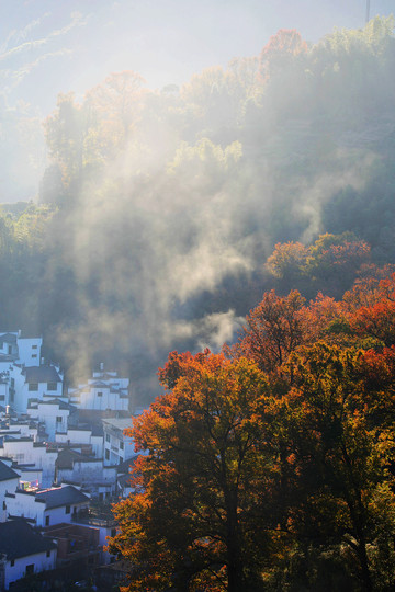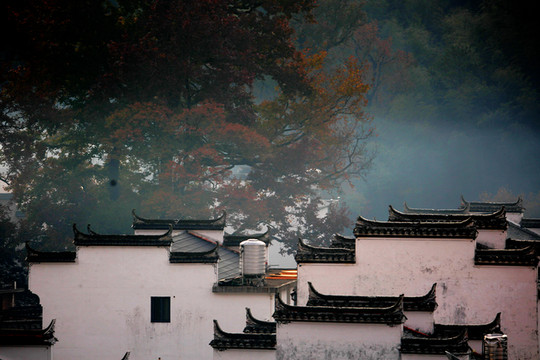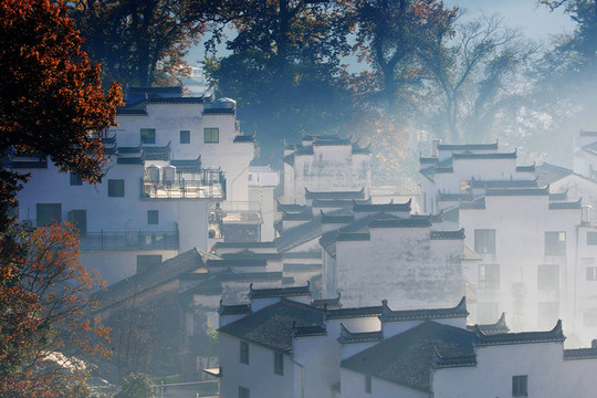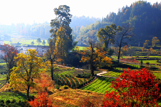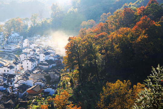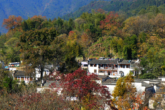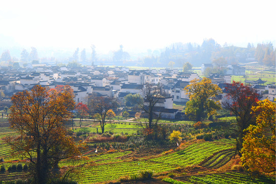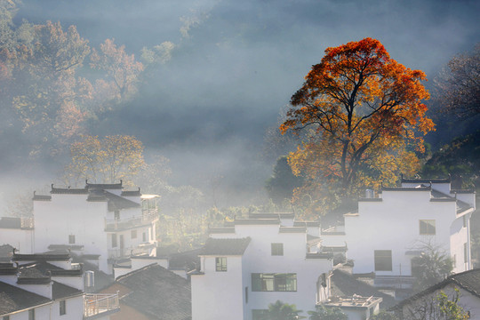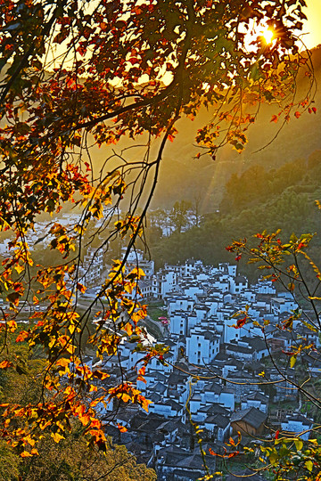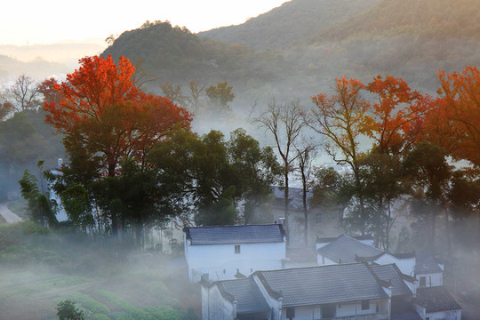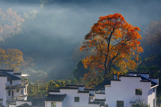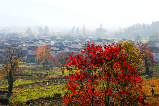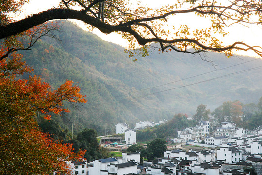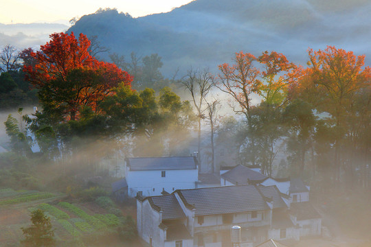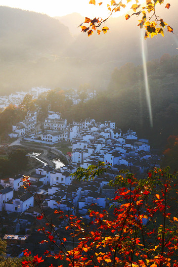 上网随便一搜婺源秋色,铺天盖地全是石城晨雾缭绕下的红枫、白墙、黑瓦,当然婺源的秋色不全在石城,我们第一站去的龙尾村,也是婺源十大赏秋地之一。