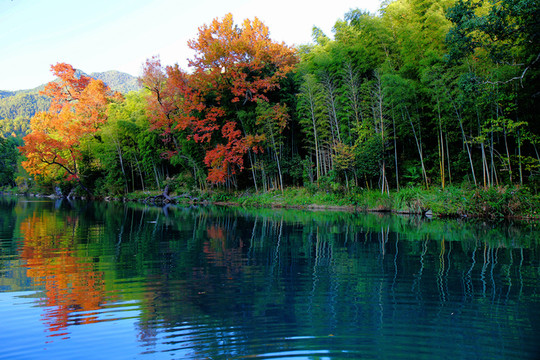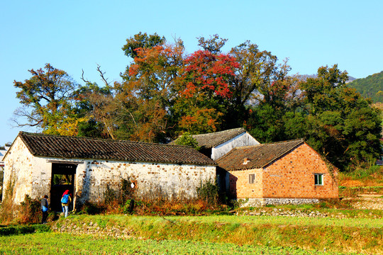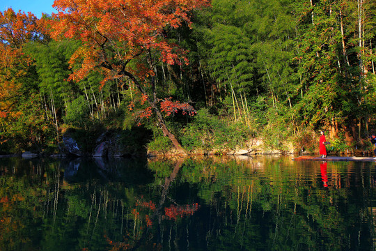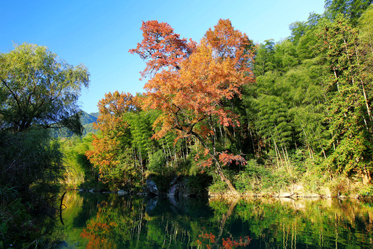 在村头停车场停好车之后,我们直接问村民水岸红枫景点在哪?顺着村民的指点,我们穿过村庄,来到村后小河边。只见河对岸满坡翠竹绿树,几棵高大的红枫显得有些鹤立鸡群。