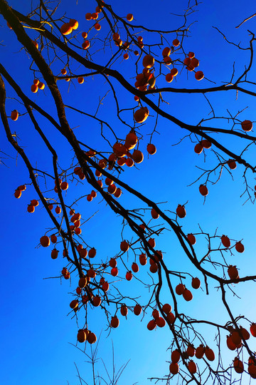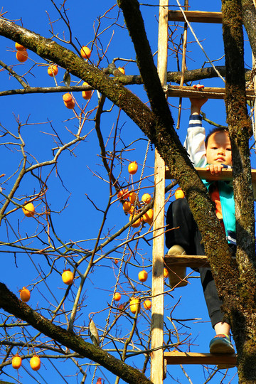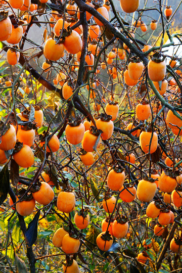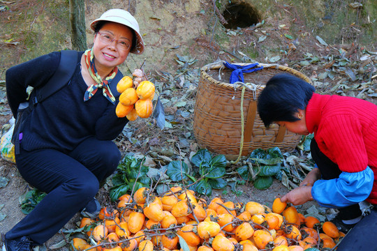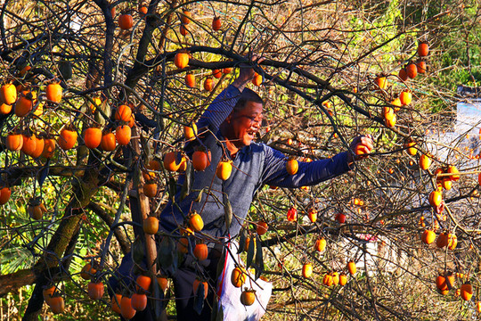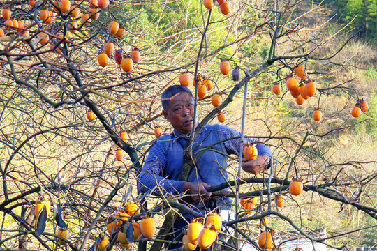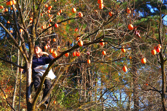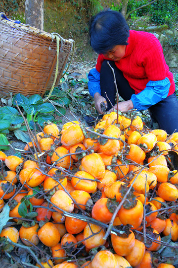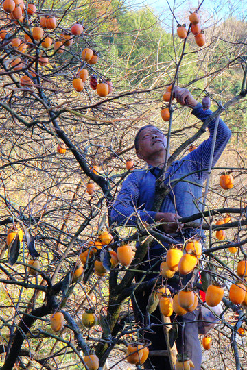 我们绕村庄爬了一圈,看见好几户人家正在采摘柿子,短短十几分钟的工夫,一棵硕果累累的柿子树,就留下了光秃的枝干,真是效率惊人。