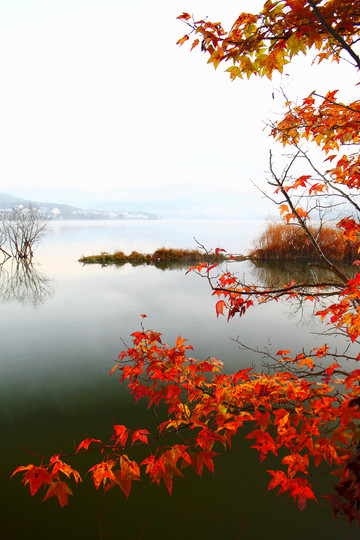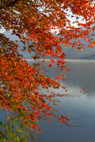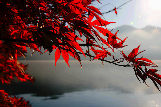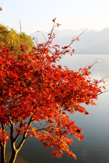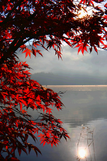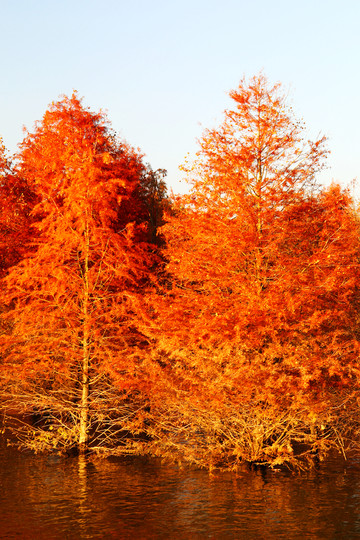 夕阳将光线尽情洒落在枫叶之上,整个枫树看起来像点着的火把一样矗立在河边。