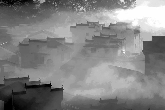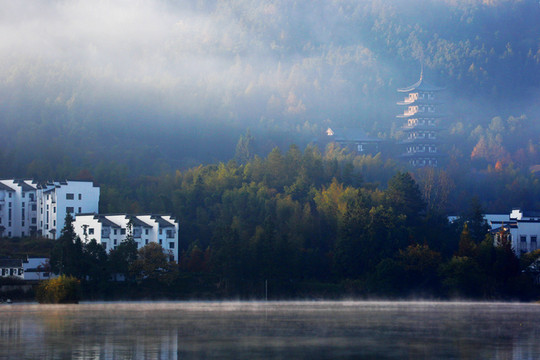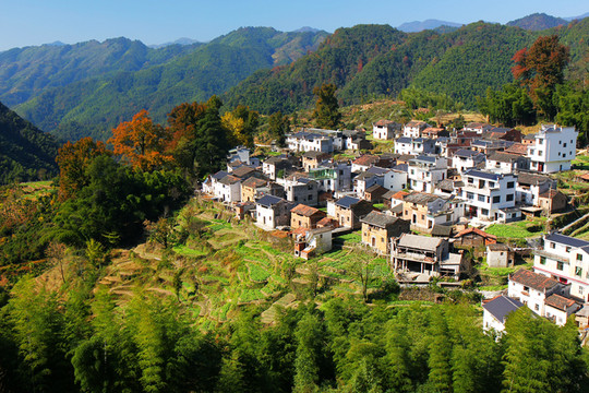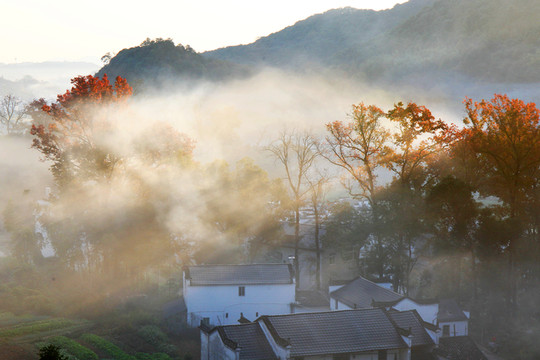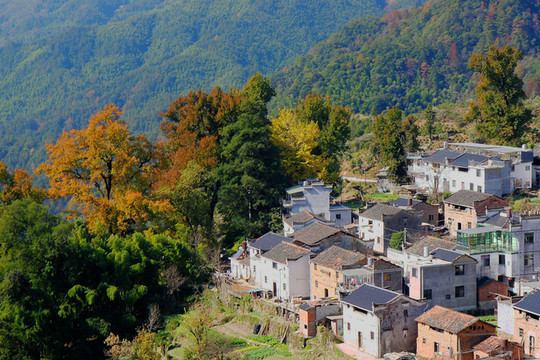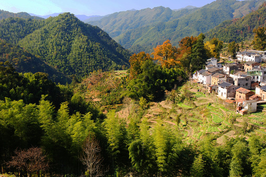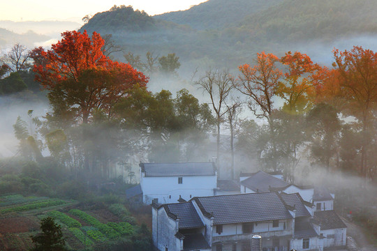这是一处高山里的古村落,向阳的山坡上错落有致地分布着近百户人家,房屋后面巨大的枫树环绕,前面有成片的竹林、梯田,最美的时候是清晨,晨雾袅绕下的村庄美若仙境。