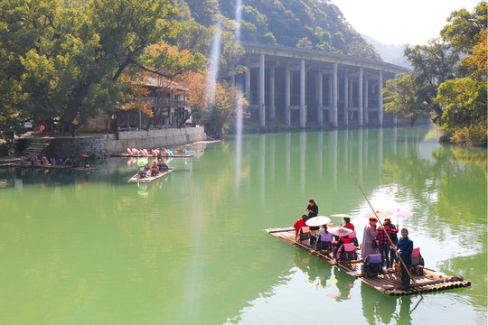 我们首先来到了游船码头,本不打算乘船,于是爬上公路,前往竹筏乘坐处,远远看见排了一条长龙,一打听,要排队一个多小时才能乘坐上竹筏,于是又返回游船码头乘船。