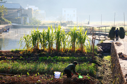 在观景平台拍摄够了后,我们沿着小道进村,路上已经有村民早起搂了一挑竹枝下山回家了,有村妇在田畴舀水浇菜,有人在码头洗衣,一派田园风光。