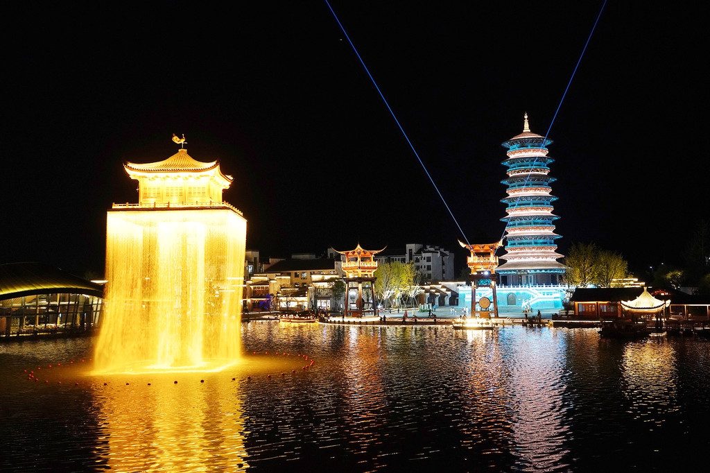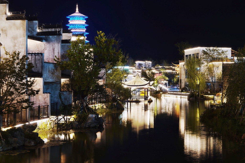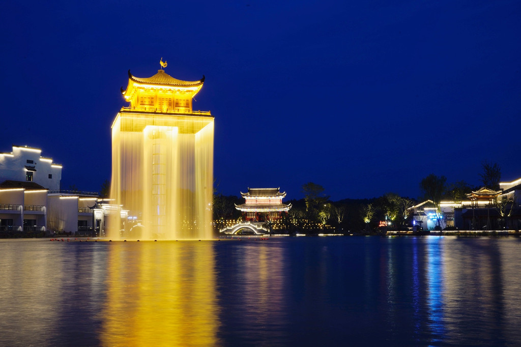 到了晚上,婺女洲度假区变成了浪漫到极致的“婺源不夜城”,湖面上的金阁喷泉和抱玉塔交相辉映宛若世外桃源。