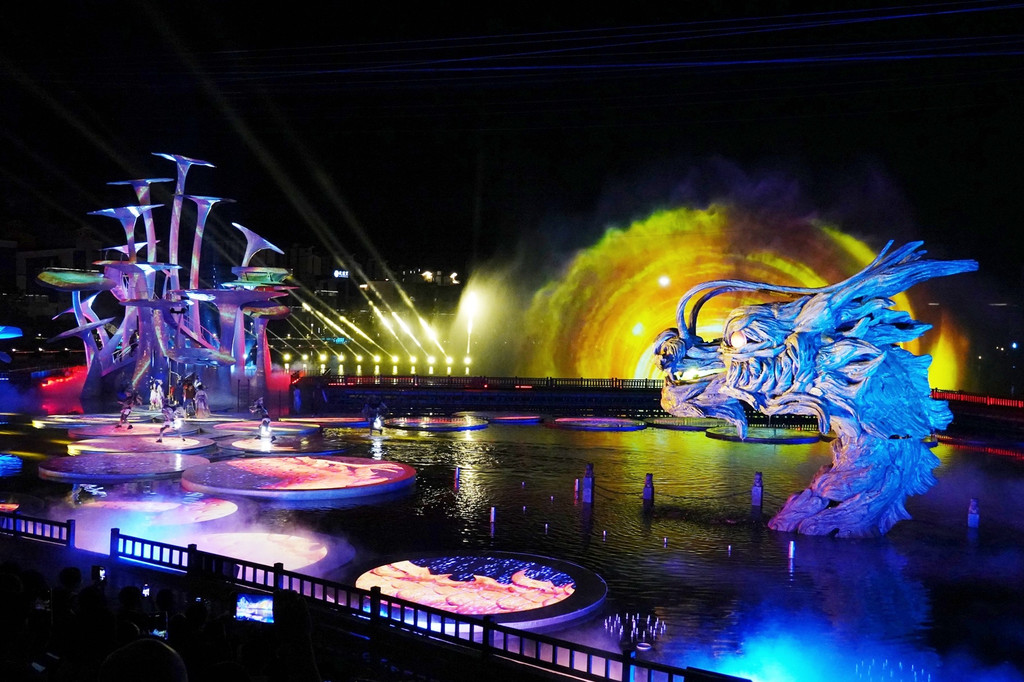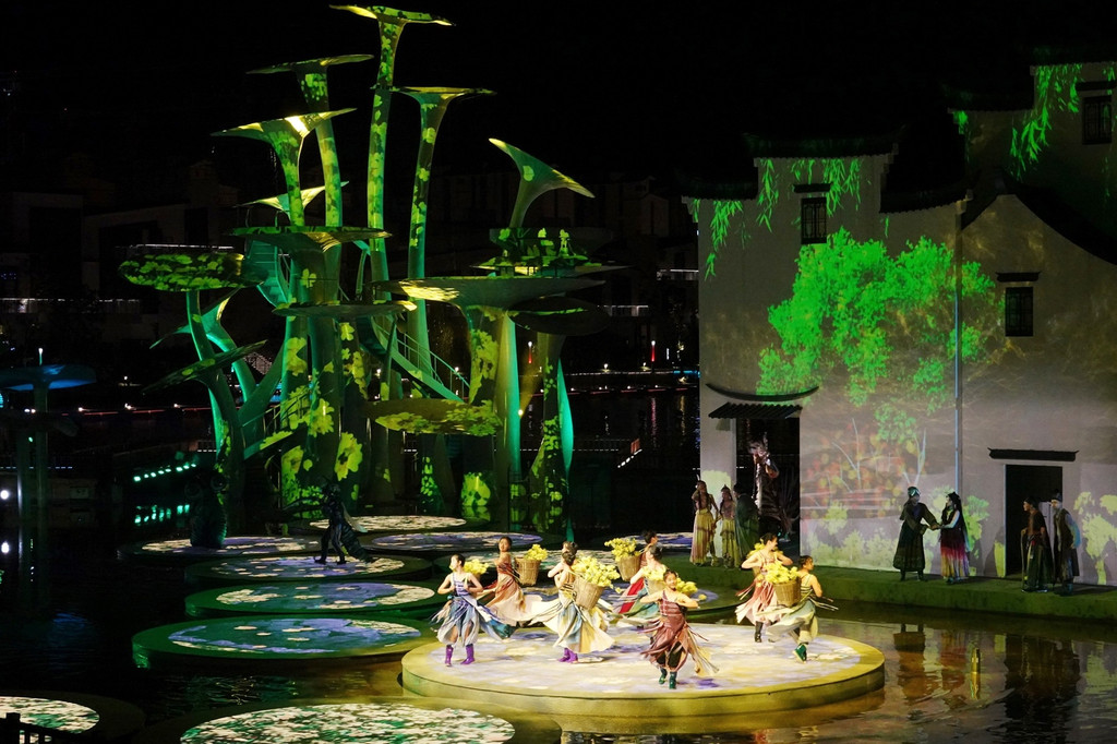 《遇见婺源》是“婺女飞天传说”的实景演出,舞美效果非常有质感,光影细腻,水舞台灵动绚烂,在灯光、投影等多种效果融合下有丰富的视觉体验。