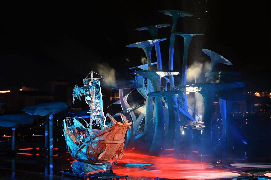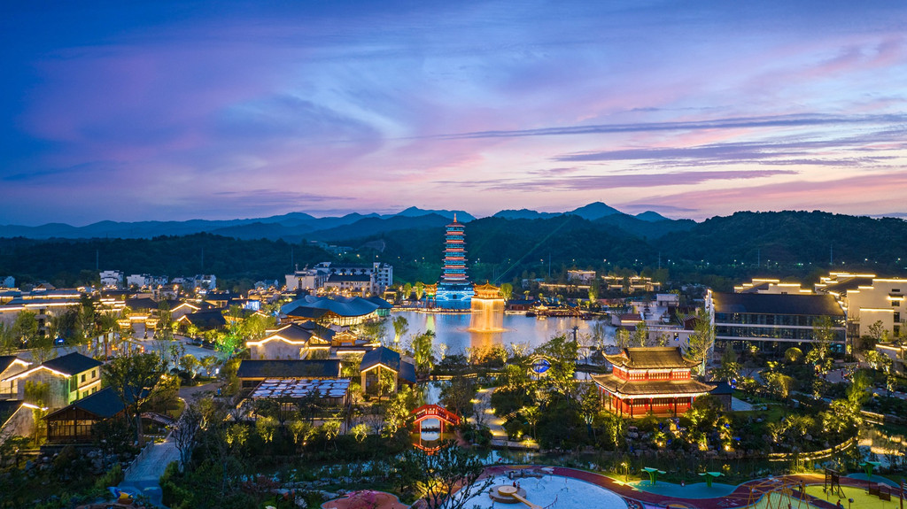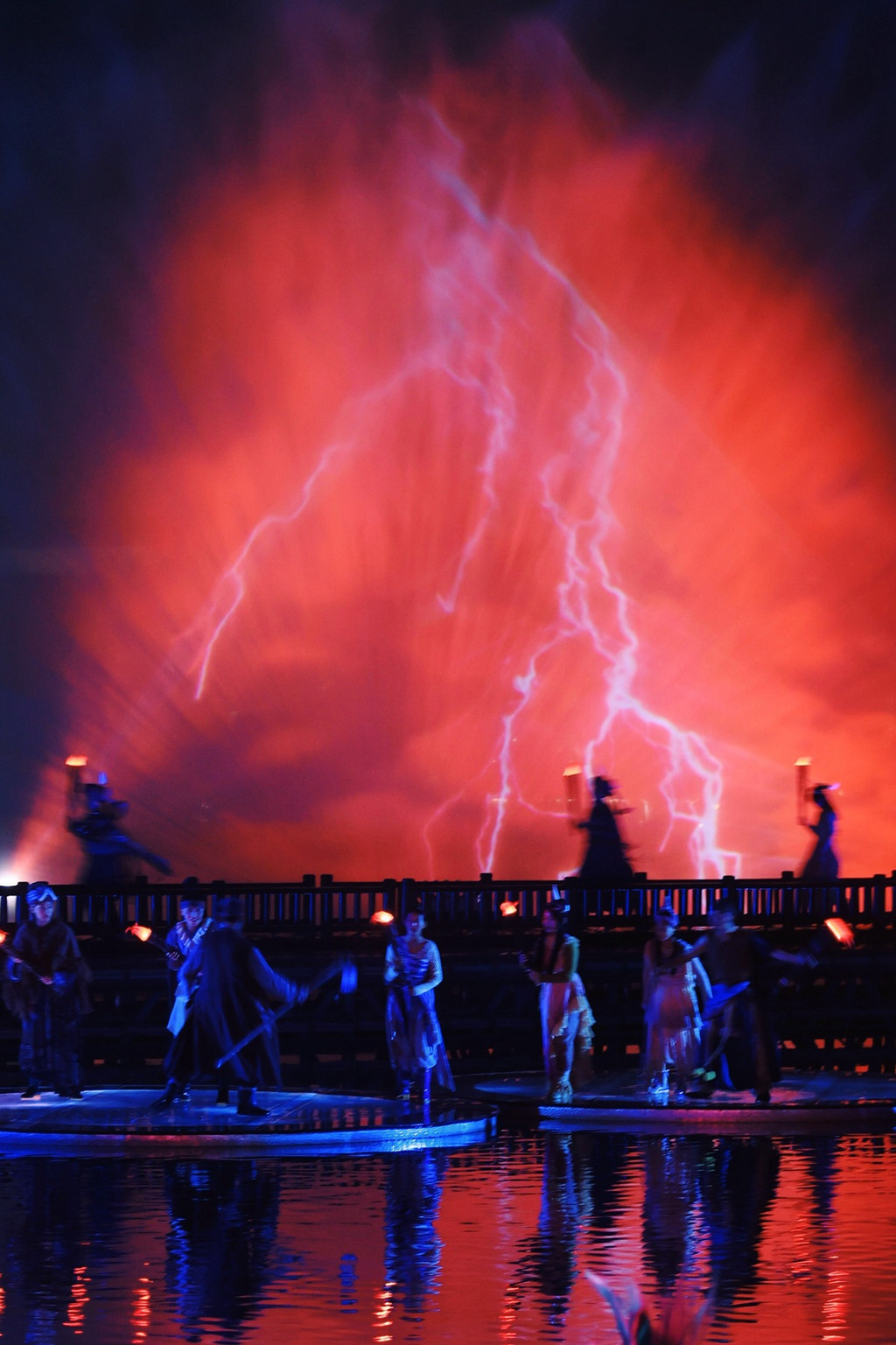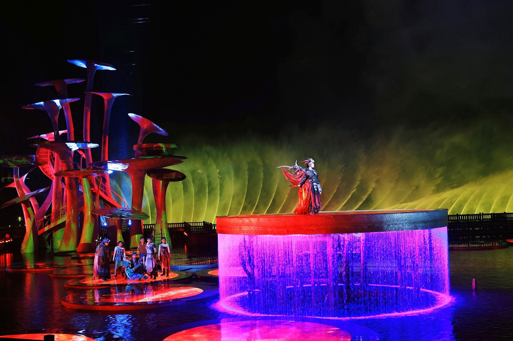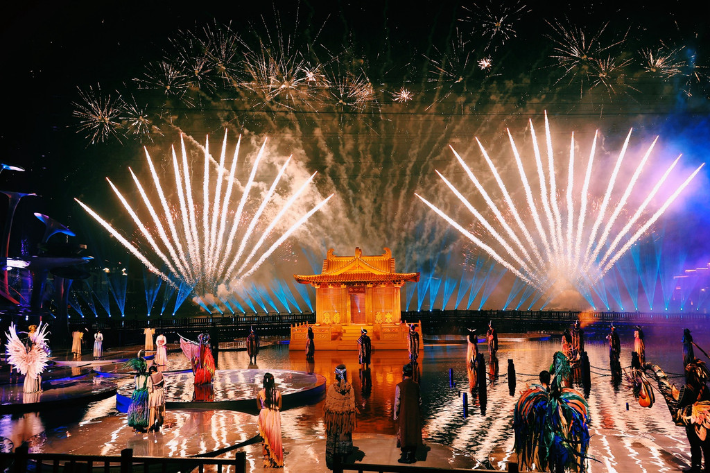 雄伟奇幻的抱玉塔,位于整个度假区的中间C位,是俯瞰整个度假区的至高点,在灯光的映射下,尽显唯美与浪漫。五显湖中的金阁水幕秀,瀑布从悬空的金阁上倾泻而下,这个以财神起源为名的《五显金光》水幕光影秀,充满祈福意味。