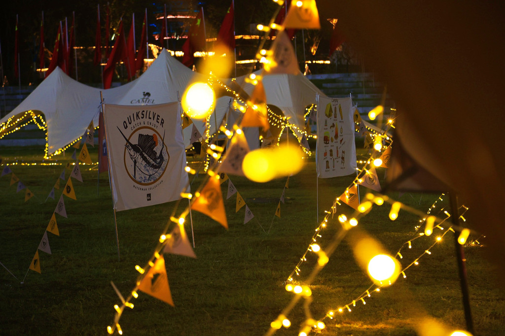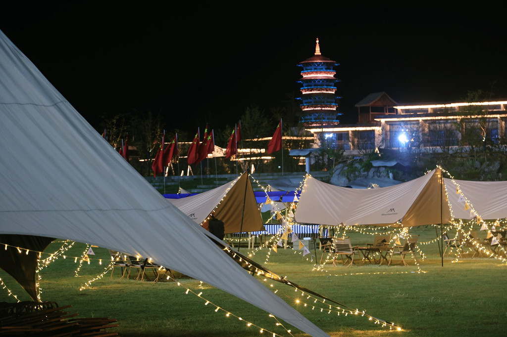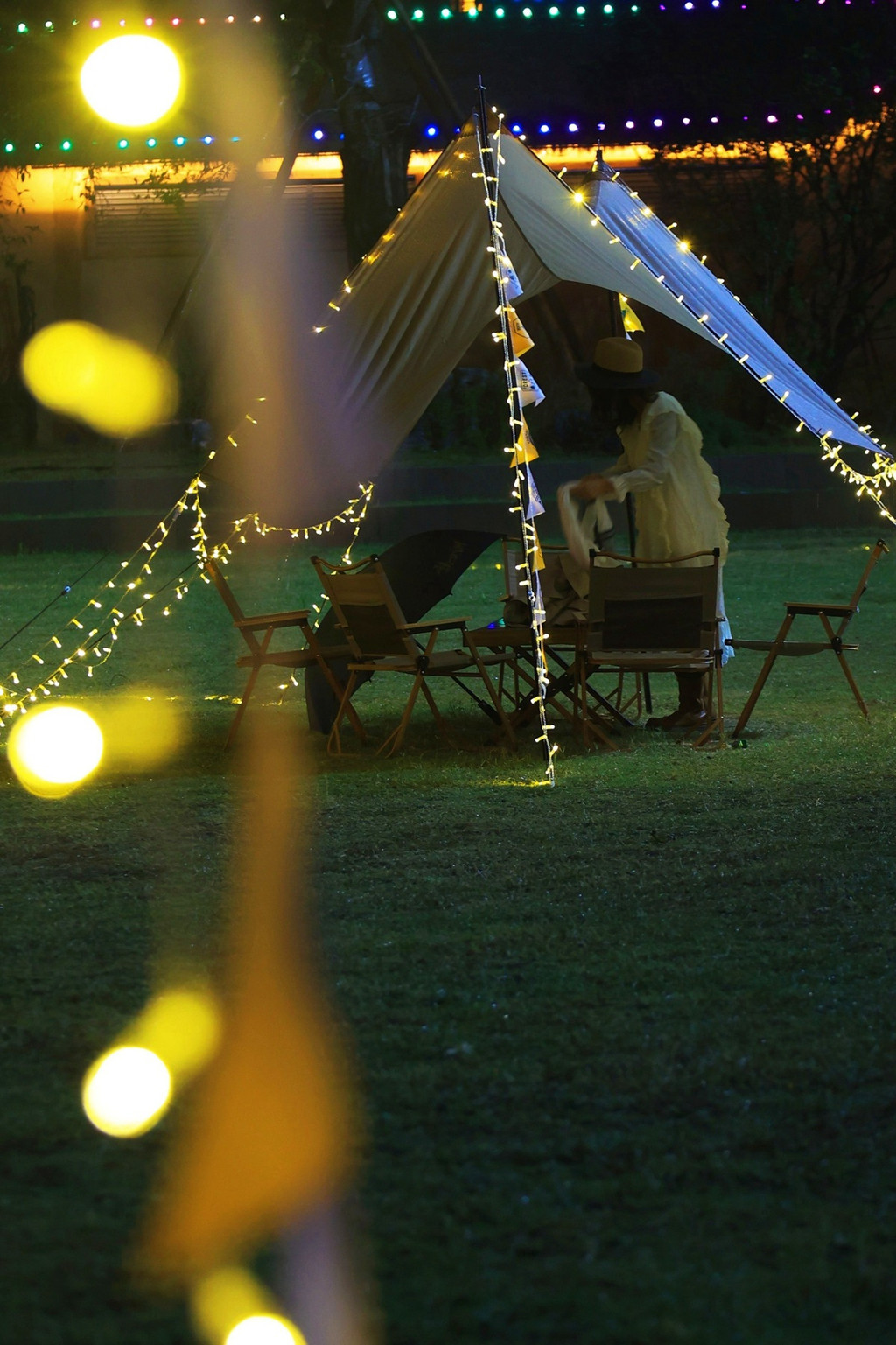 秋雨绵绵,但音乐广场上的露营地氛围感满满,绿草如因,光影迷离,月光下的营地星光点点,浪漫无边,拍照效果绝佳。