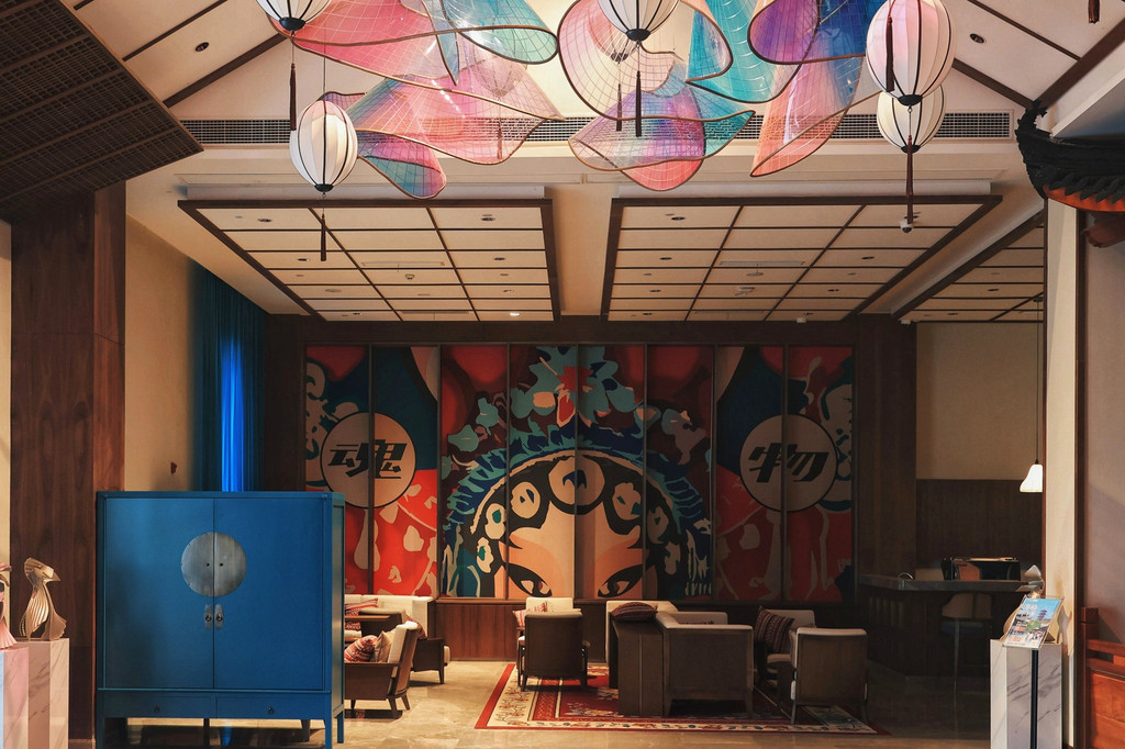 我这次住在位于芳烟岛上的无梦酒店,紧邻婺女湖,是一家以徽剧和徽艺为主题的精品酒店,外形以徽派建筑为蓝本,内部展现出传统戏剧的特色。