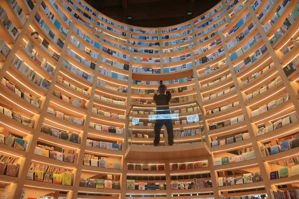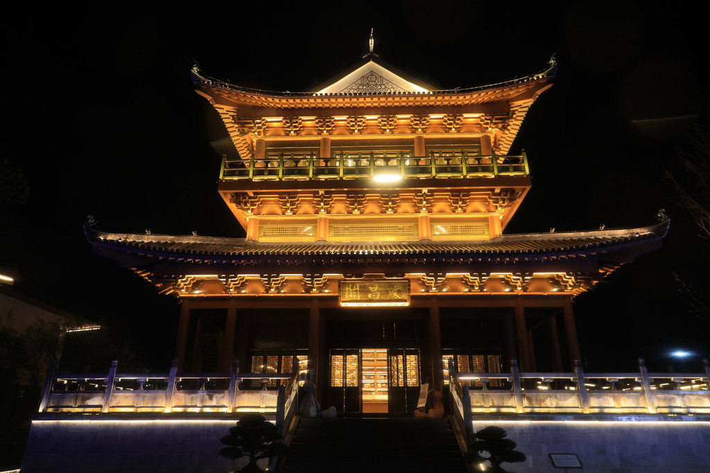 这座文昌阁外形古朴,飞檐斗拱。内部却十分新潮现代,半圆形的书架如同一本正被翻阅的古书,与高大的屋顶结合给人很强的视觉冲击,也很符合现代人的审美,很多人来此打卡拍照,是园区内不折不扣的网红打卡点。