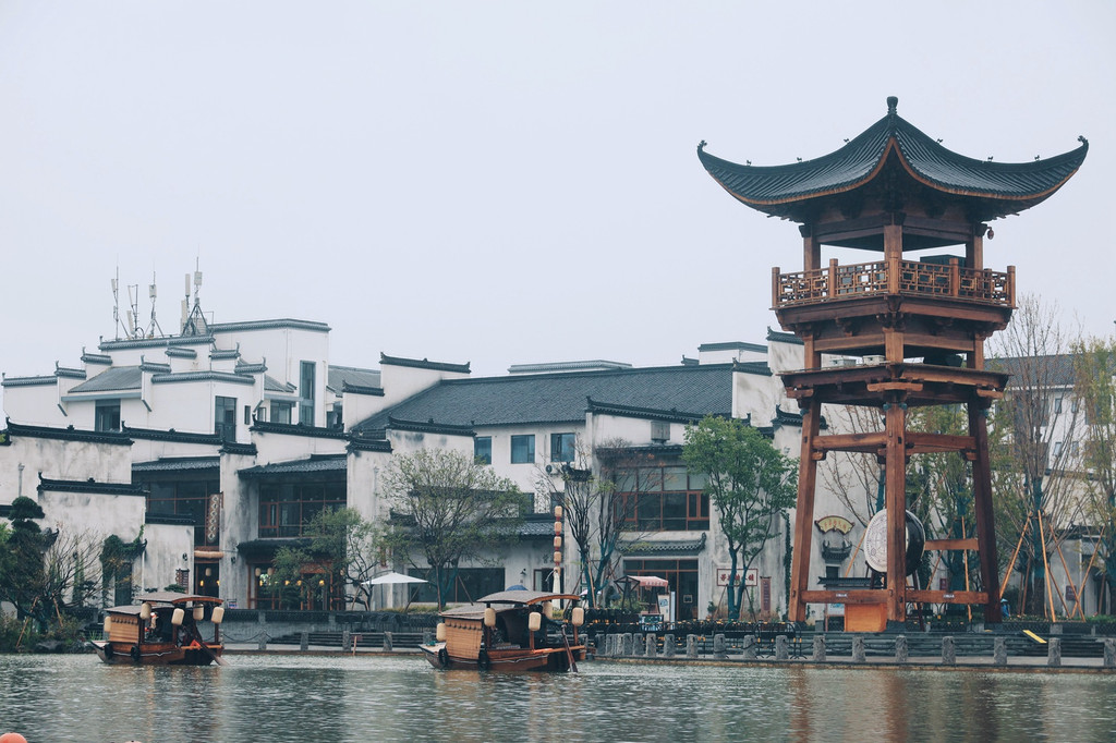 塔对面的婺女湖上时不时会有花船驶过,随着漫天小雨飘来悠扬动听的江南小调,身着汉服的演员,在精心装扮的花船上翩翩起舞,让人想起昔日徽州的繁华。