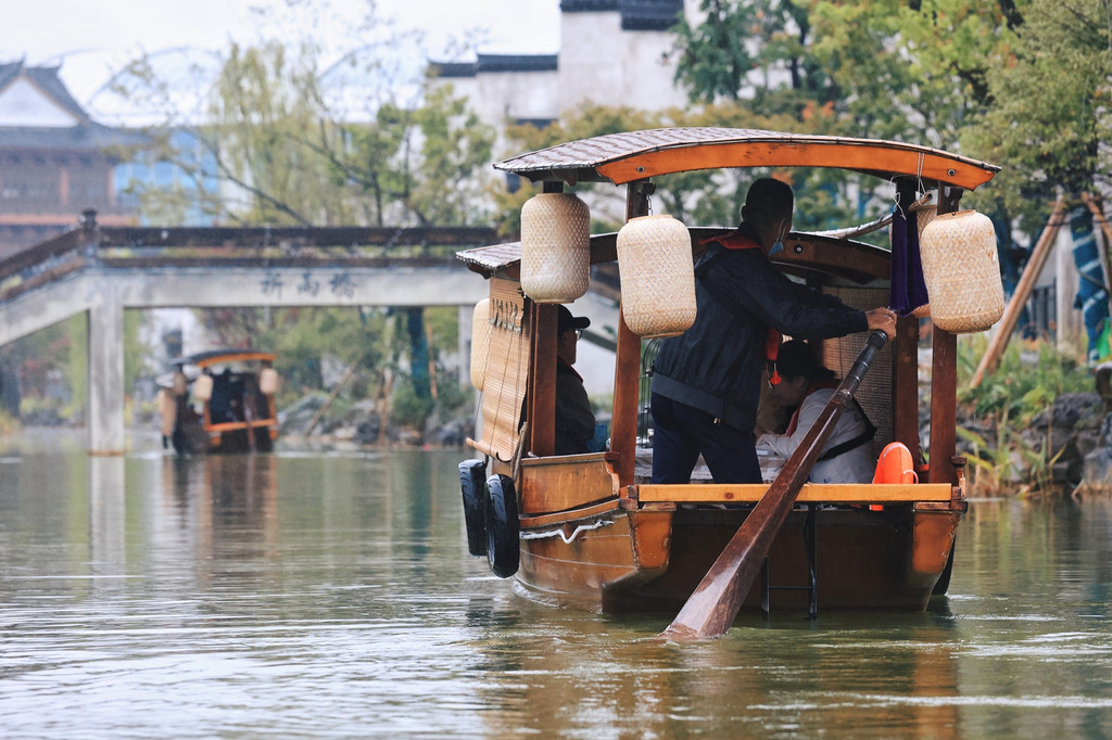 游船下午茶也是景区一大特色,秋日里,乘坐摇橹船徜徉在徽州水路之上,不急不慢,缓缓而进,粉墙黛瓦,青山入画,江南的秀美风光尽收眼底。