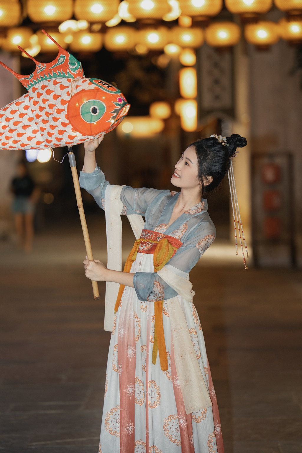 在灯光摇曳的徽市街感受穿越年代的梦幻,去傩舞广场看祭赛神和鱼灯巡游,小姐姐小哥哥们穿上汉服,会有很强的代入感。
