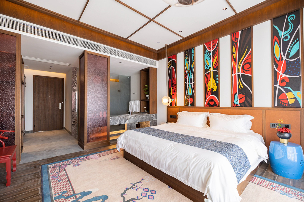 房间内部色彩搭配和谐,古代与现代相结合,我的房间窗外就是湖景,不出房间就能看到金阁水幕秀,时不时还有花船迅游而过。