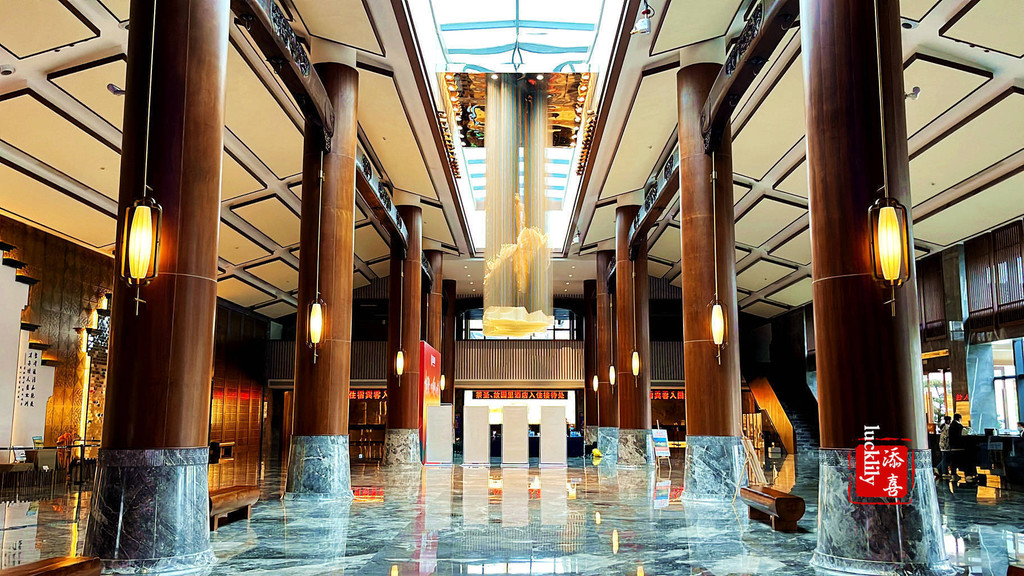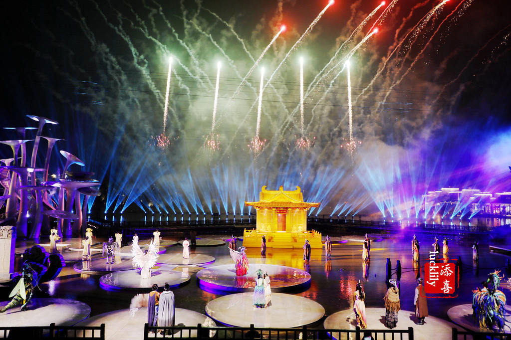 以五显财神起源及故事为核心元素的祈福文化水幕光影秀《五显金光》,原来这就是我客房落地窗外的金阁,到了夜间灯光加持后更是金灿夺目。