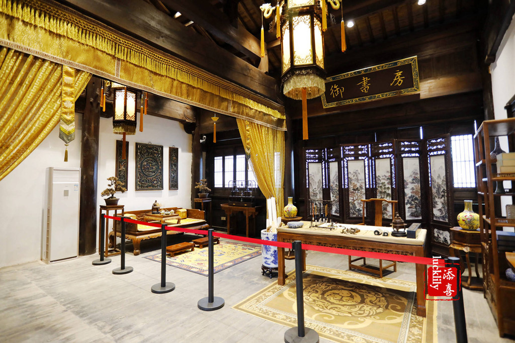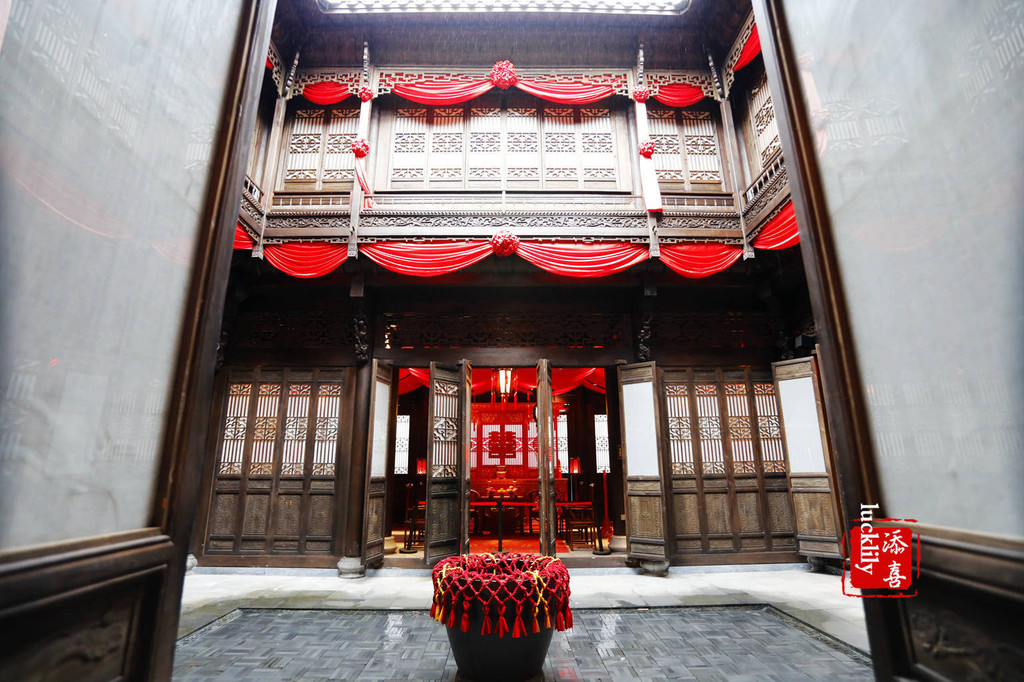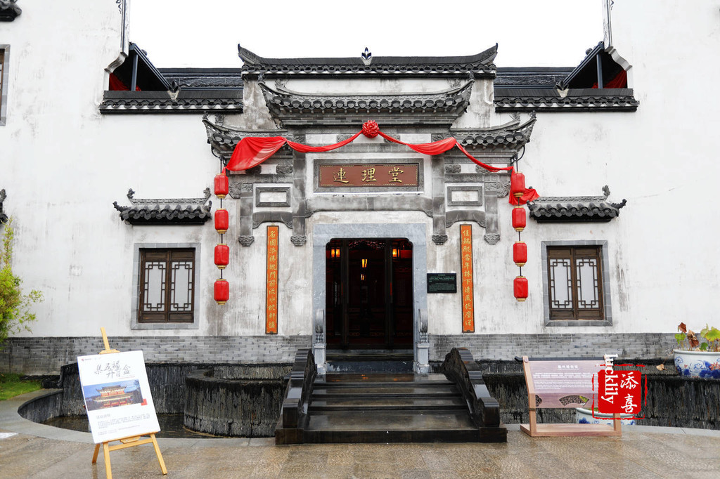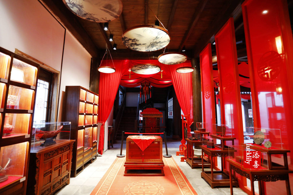 婺女洲内最喜庆的一个场馆,向游客们呈现了徽州传统婚俗文化,全馆分为两层。一层为婚嫁民俗展示区,包含拜堂区、家宴厨房展示区、换装体验区、文创区等,二层以另一视角展示了女子初嫁前后的生活之别,包含闺房、书房、长辈房和婚房等,连理堂的天井定期都会有实景演出抛绣球。