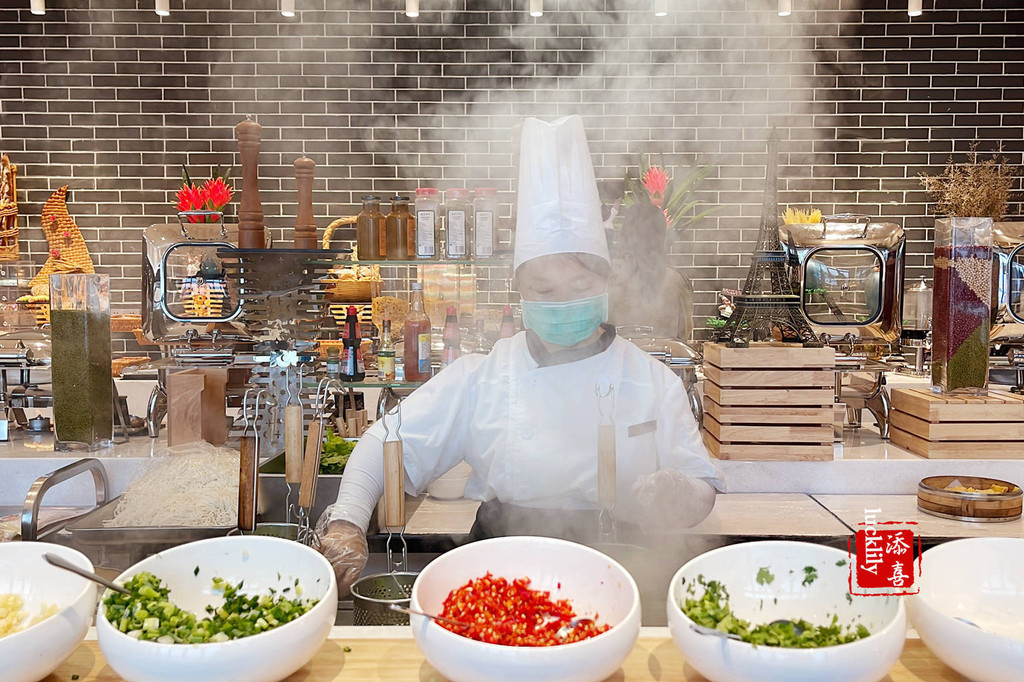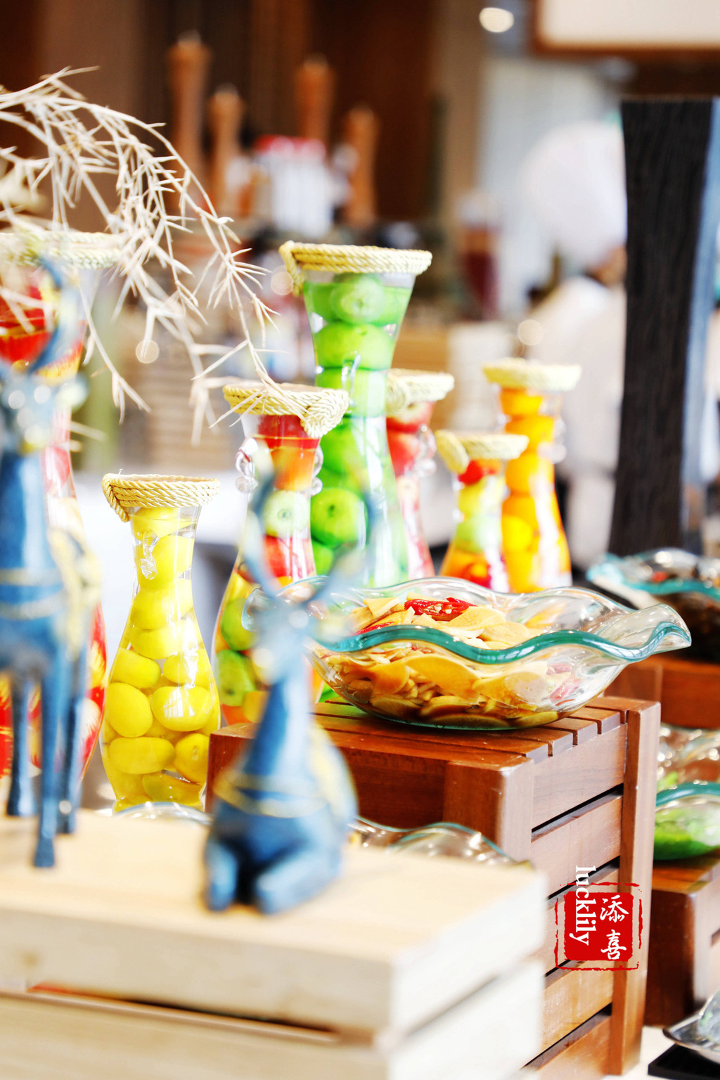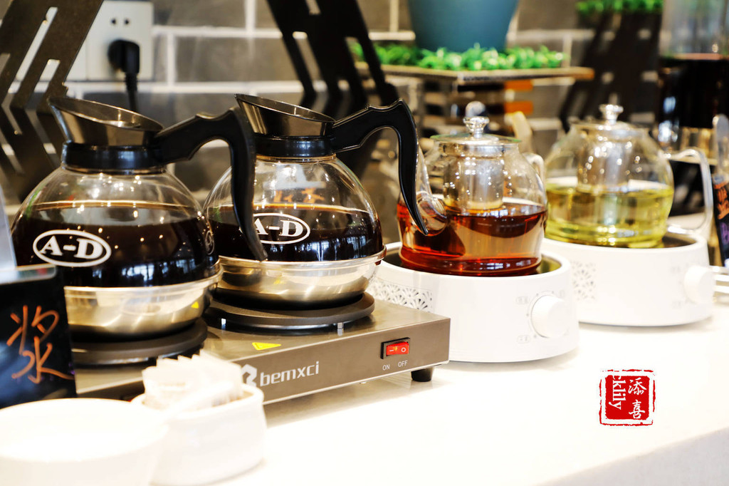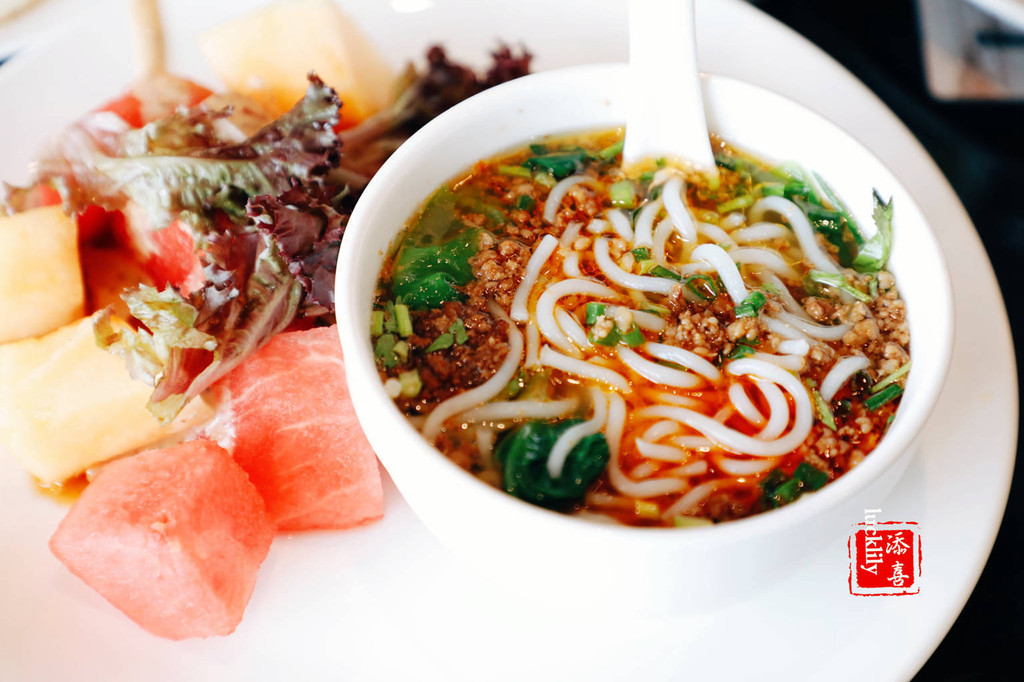 酒店的早餐时间到9:30,中西式结合,菜品可以说是应有尽有,超级丰富,尤其推荐面档,江西的美食里自然是少不了一碗米粉的,与其他城市不同的是,米粉干捞在碗里清清爽爽的盖了几片叶菜,没有加上汤,因为江西拌粉很出名啊,边上一圈浇头,辣子鸡、肉燥、雪菜肉丝……还有一大堆调料,自己加了拌,我二天早餐吃了拌粉,第三天早餐吃了汤粉,汤底也是熬得浓浓的高汤,超级鲜美。此外,早点里面还可品尝到“糊”、“腐乳”“汽糕”、“豆腐包”等婺源特色小号。