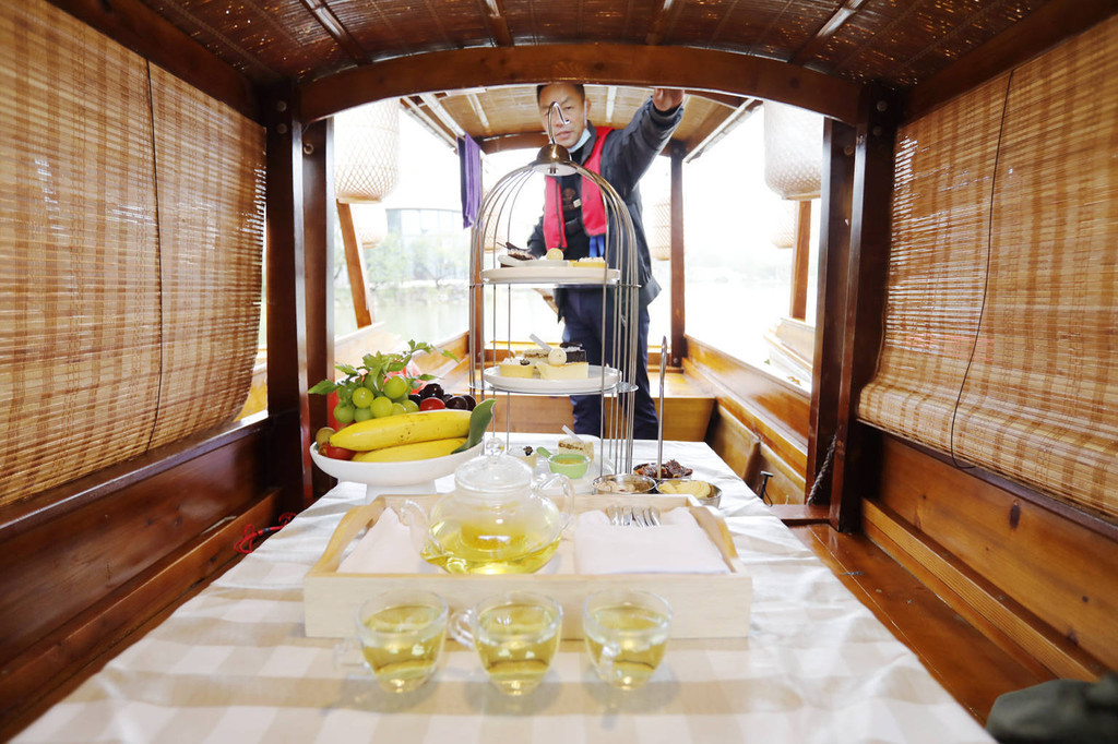 下午的时光悠然的晃荡在摇撸船上了,点了丰盛的双人下午茶,正好是小长假的后的第一个工作日,摇船的大哥说今天明显得空些了,于是给我们讲了很多关于婺源和婺女洲景区的故事,甚至还让我体验了一把摇橹的快乐。