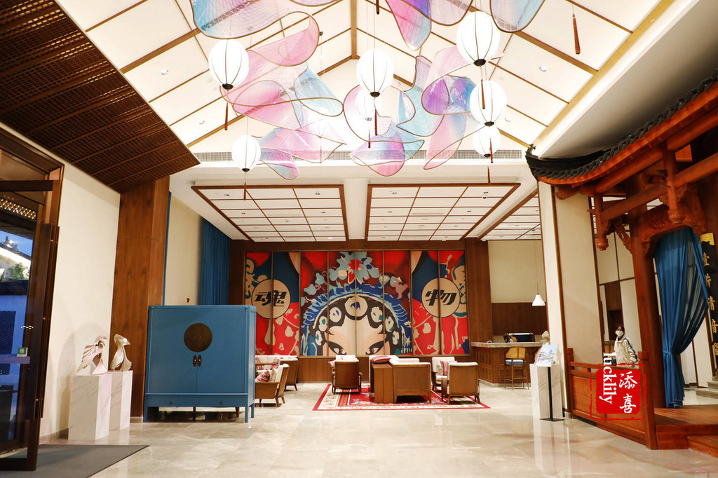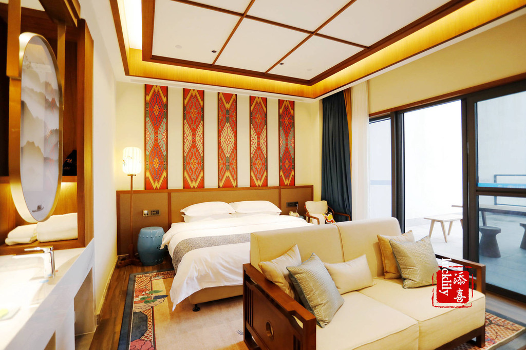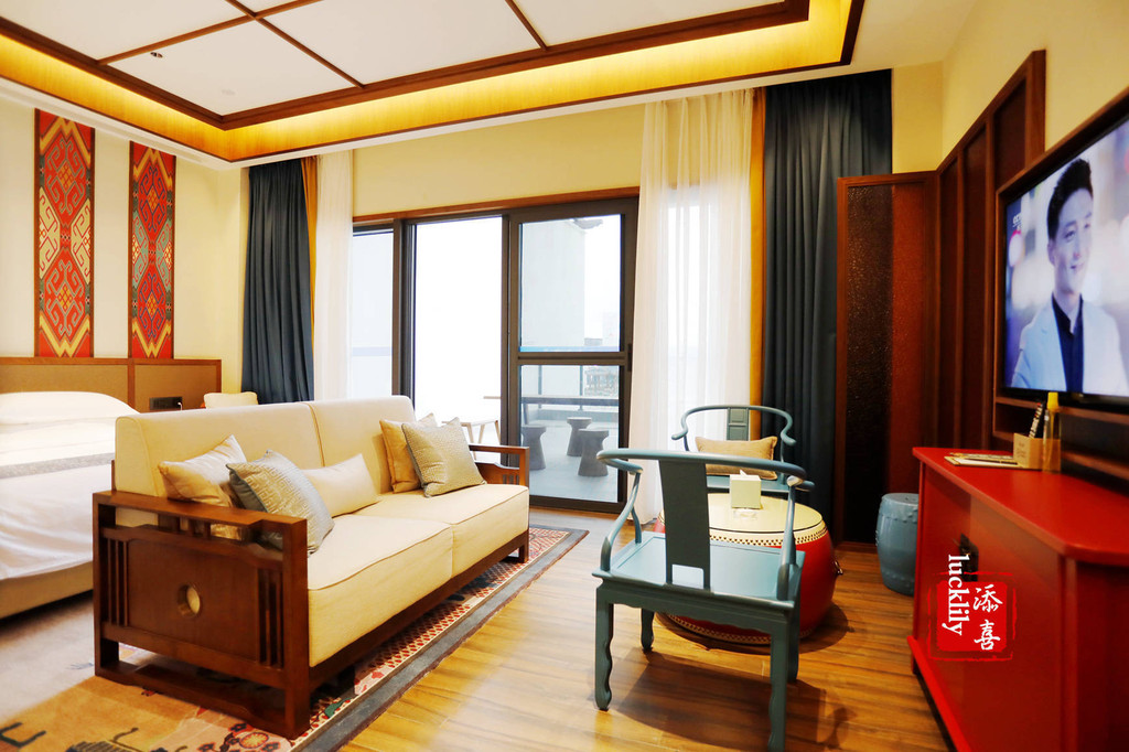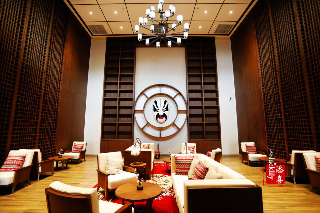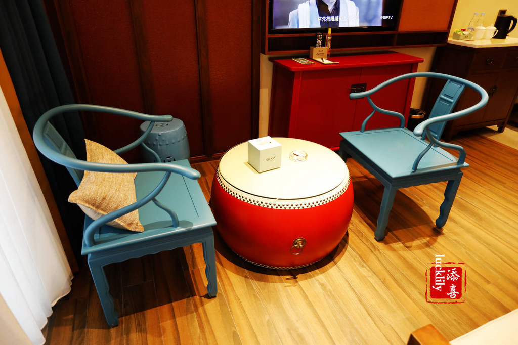 每个房型非常考究,将山水引入室内,打造具有古典韵味艺术和现代舒适的下榻空间。优雅的中国红与湖蓝相映成趣,这种炫彩的光感与色泽之前只在戏中见,而今却真的是我在曲中度。宽幅的湖蓝色太师椅,红鼓为桌,大胆而张扬的构画给到客人充分的释放,这一室之主当得悠闲自得。