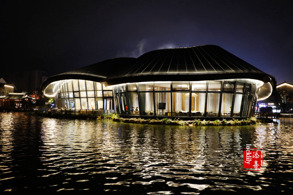 从我的房间望出去,对面就是水上餐厅,这也是婺女洲景区内最大的餐厅,有400个多个餐席。到了晚间水上餐厅大幅的落里窗里灯火通透,与湖面的光影交织在一起,更是五显湖上的一面风景。