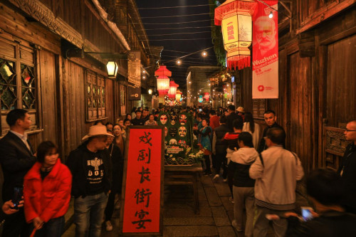 乌镇戏剧节长街宴,让所有的戏剧人、工作人员在长街相聚,在热气腾腾的食物面前,享受美味带来的味蕾冲击,在推杯换盏之间畅聊人生,乐此不疲。所有的不言之言都随着暖锅的热气慢慢升腾,在灯月之下化成温柔的雾气,笼罩了整个乌镇。