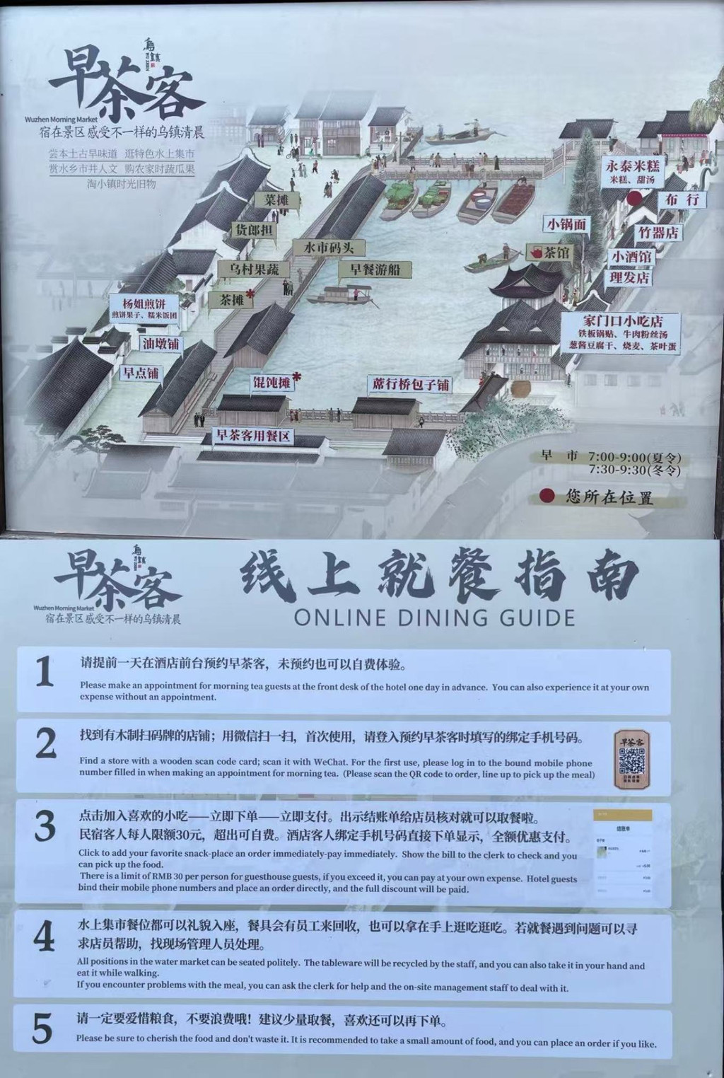 水上集市内分布有20家早点摊位,食客可从中任选喜欢的早点,临河而坐,享美食、赏美景,还能观看戏曲表演。在入住酒店时,需通过酒店前台提前一天预约,每日限额350人,民宿住客享30元/人限额,超出部分自费;酒店住客全额免费。