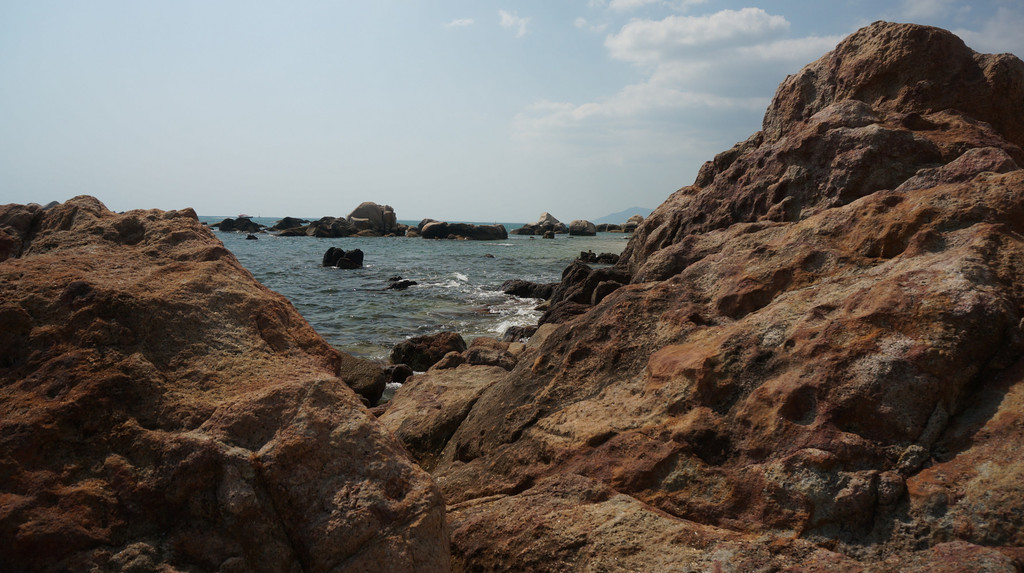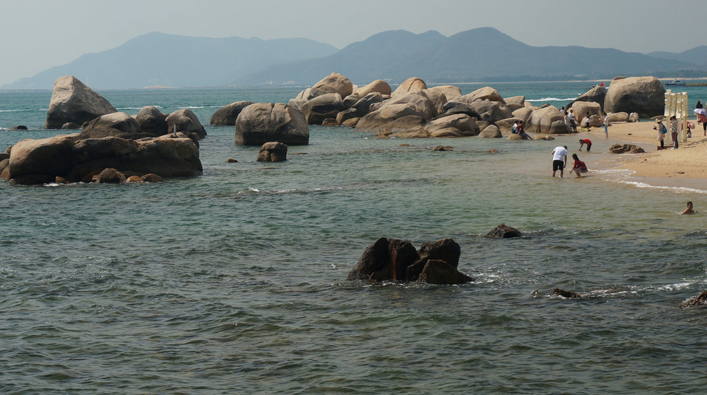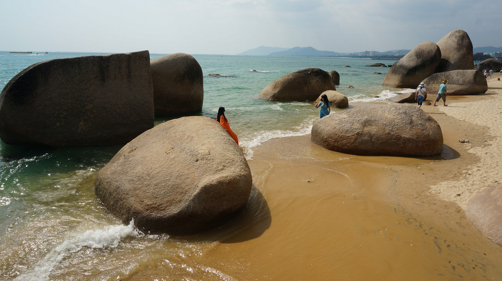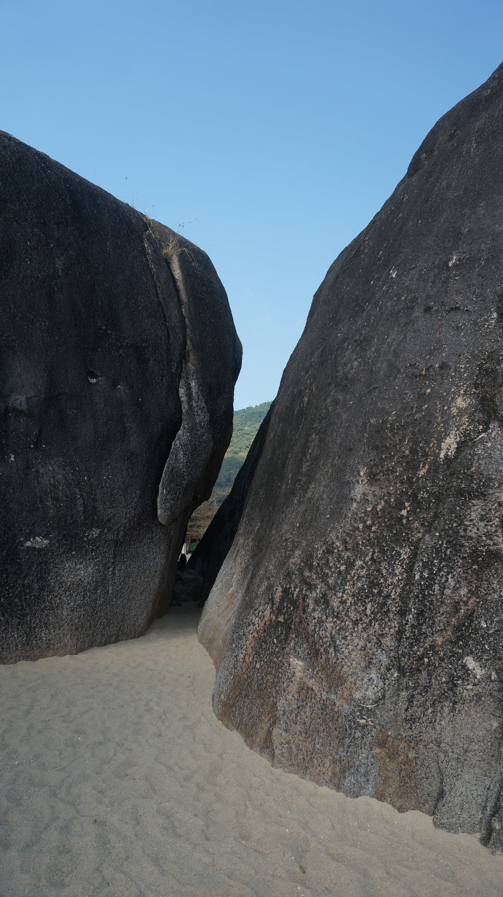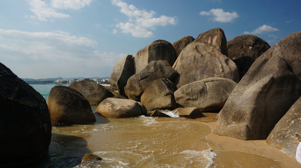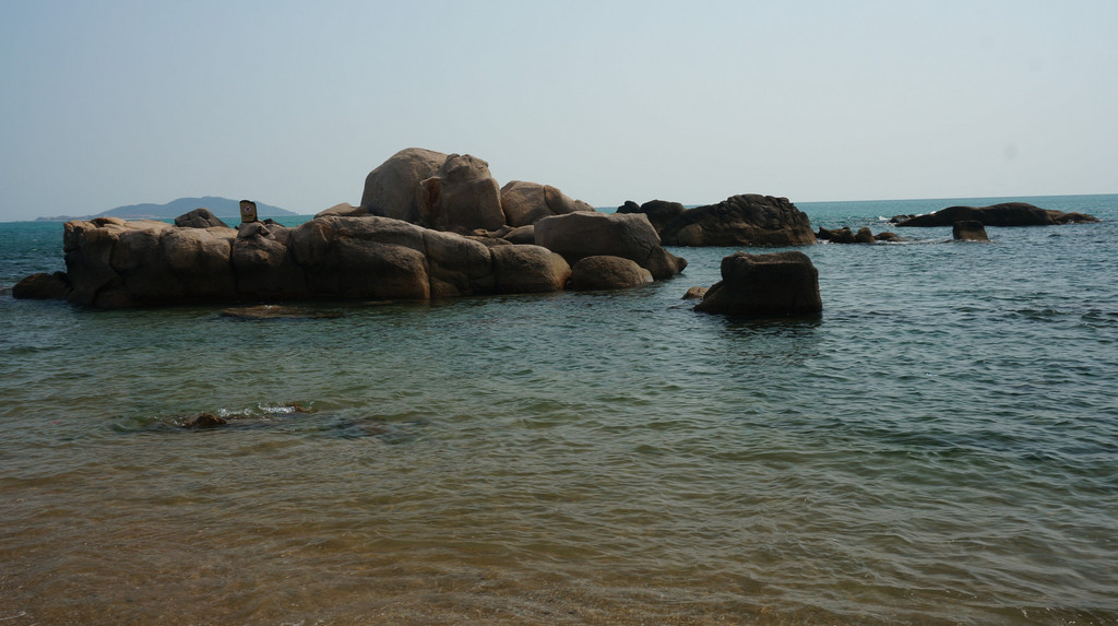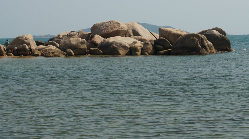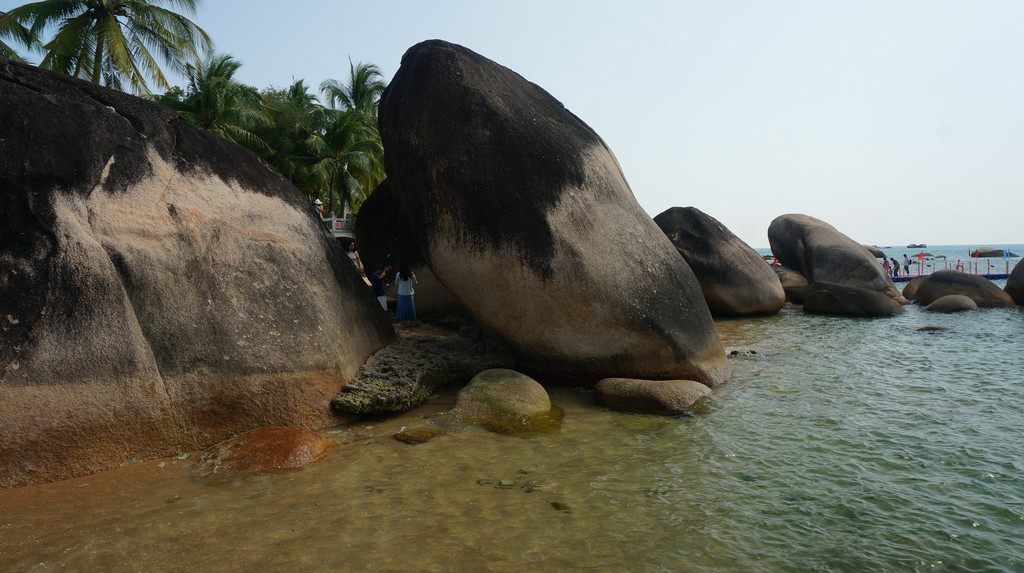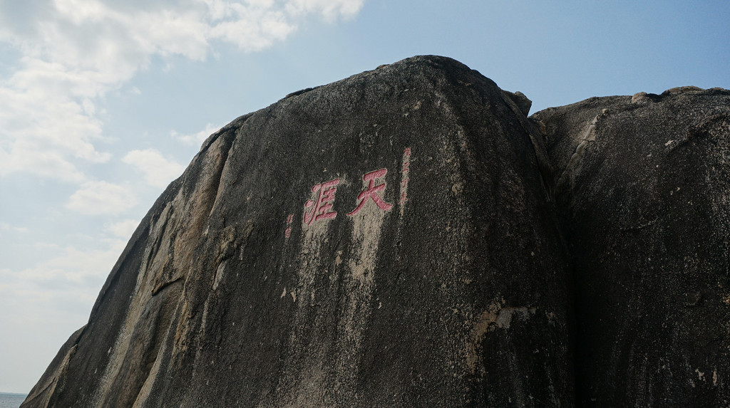 海角石藏在一大堆巨石之间,面朝外侧,如果不是一群人在此照相,还真容易错过。从海滩上走过去的路涨潮时会被淹没,得做好趟水的准备。