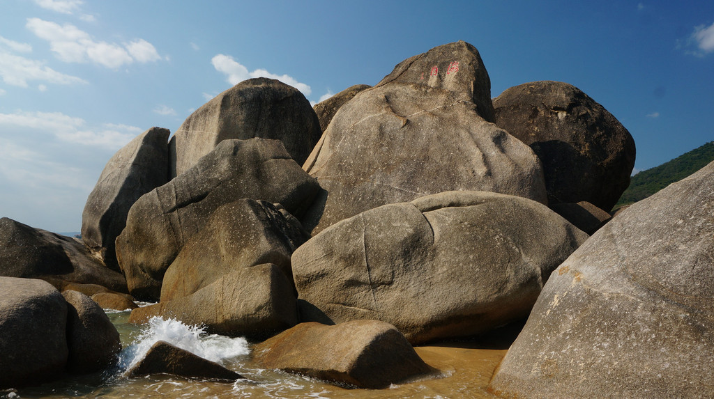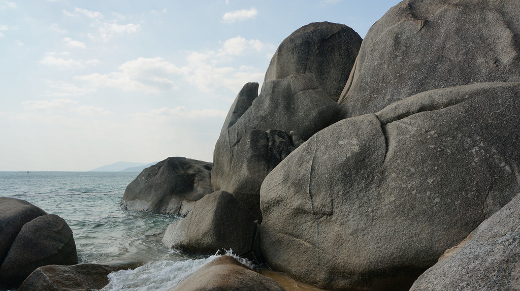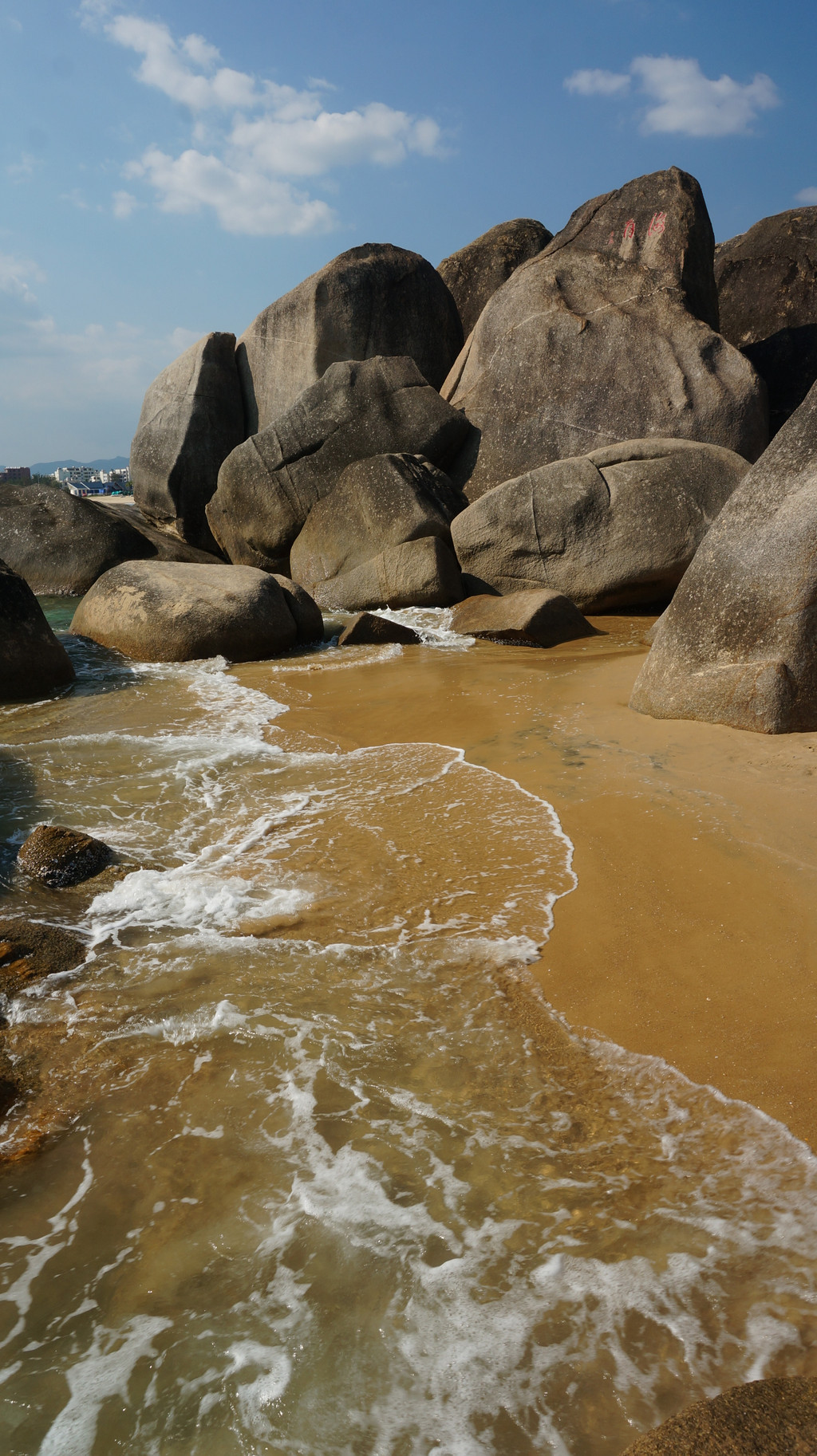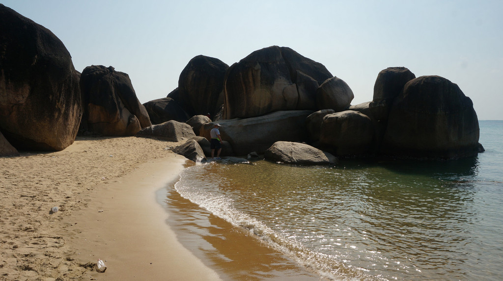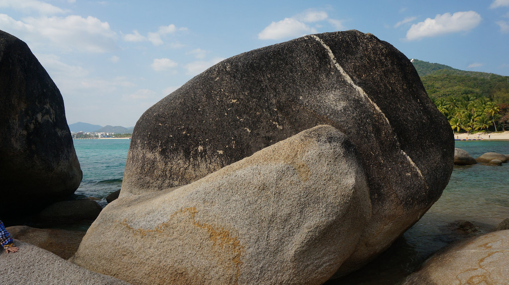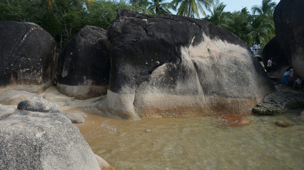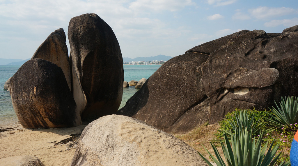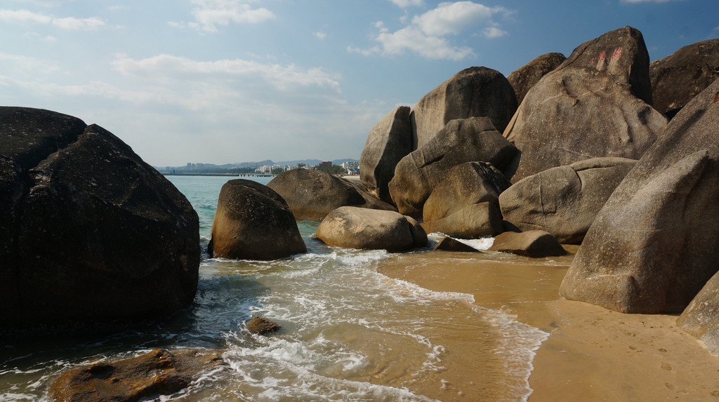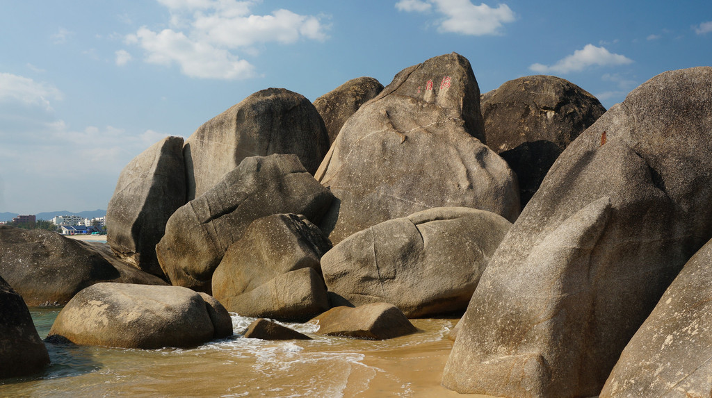海角石藏在一大堆巨石之间,面朝外侧,如果不是一群人在此照相,还真容易错过。从海滩上走过去的路涨潮时会被淹没,得做好趟水的准备。