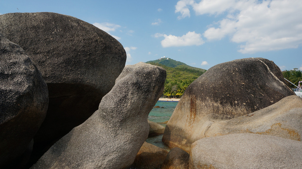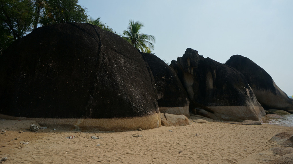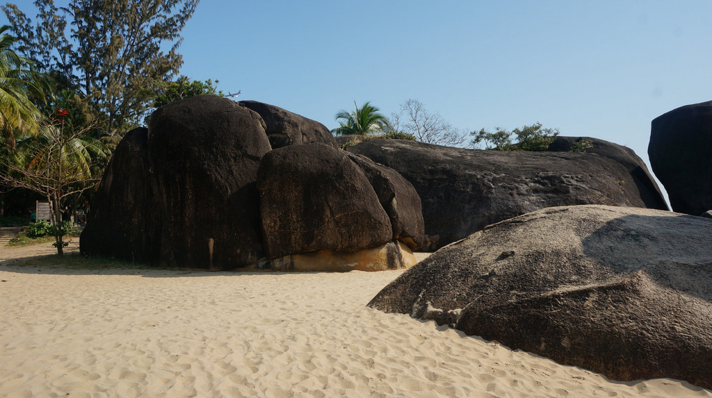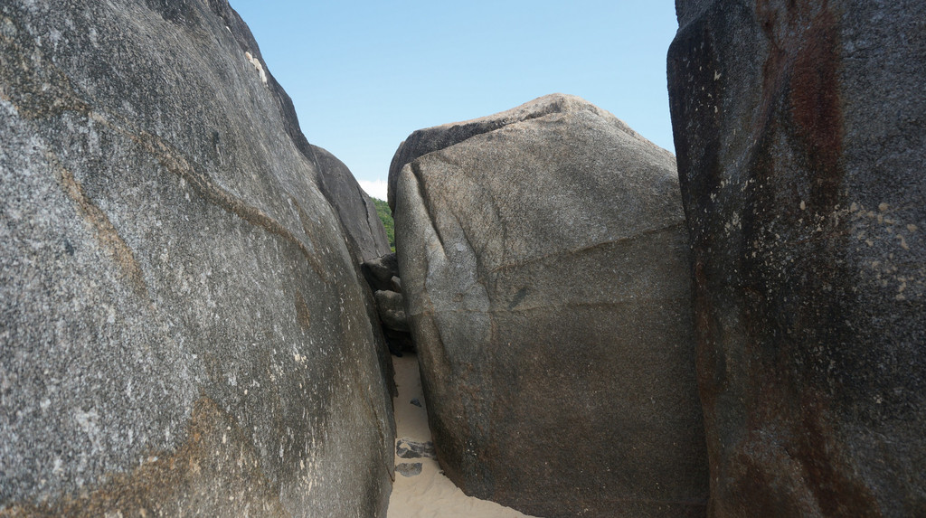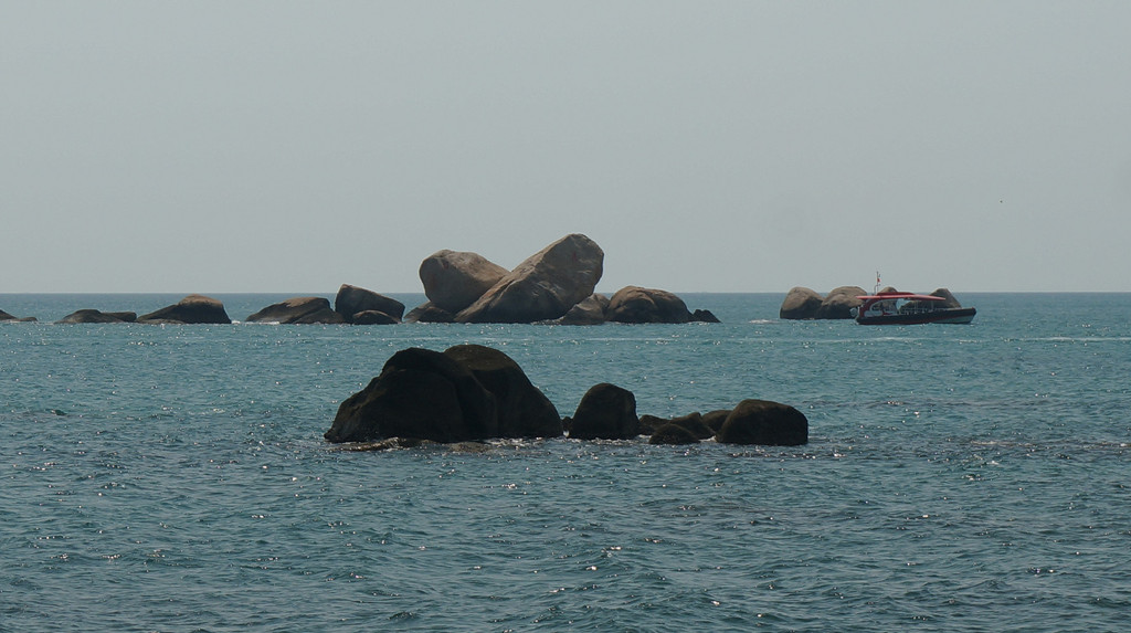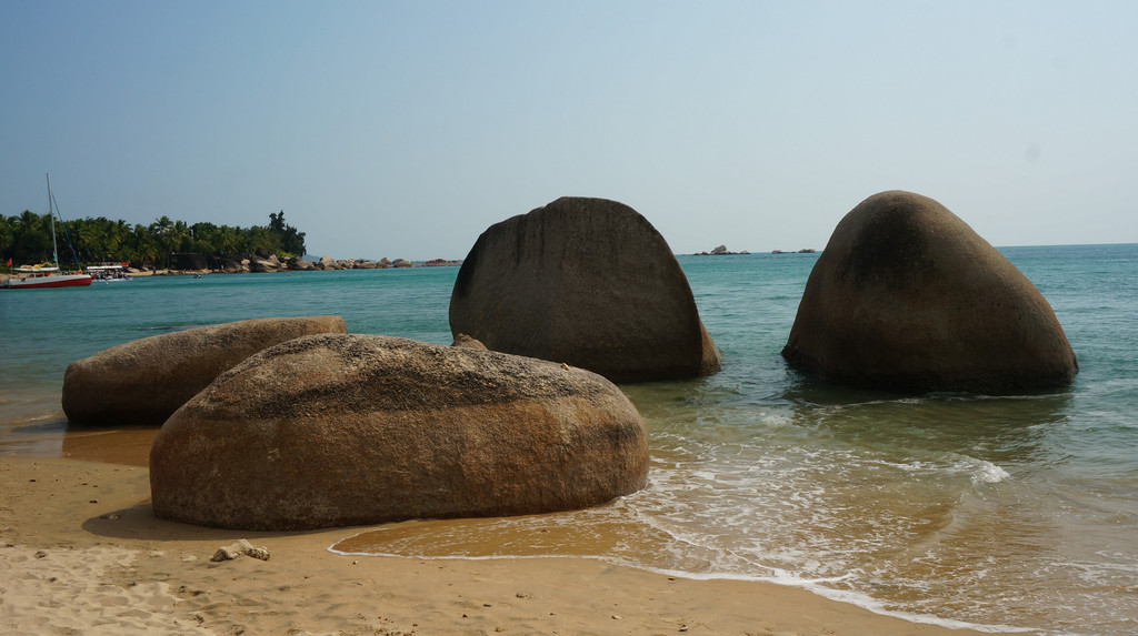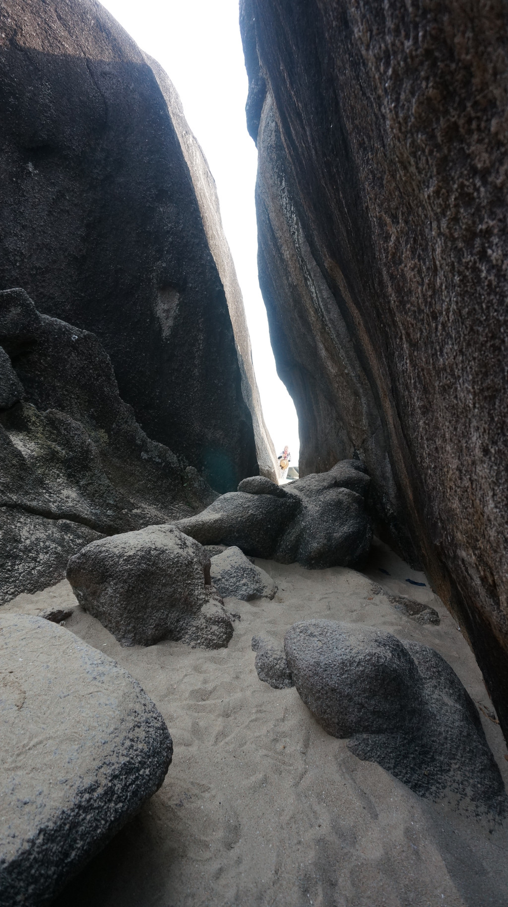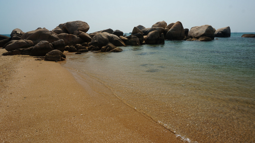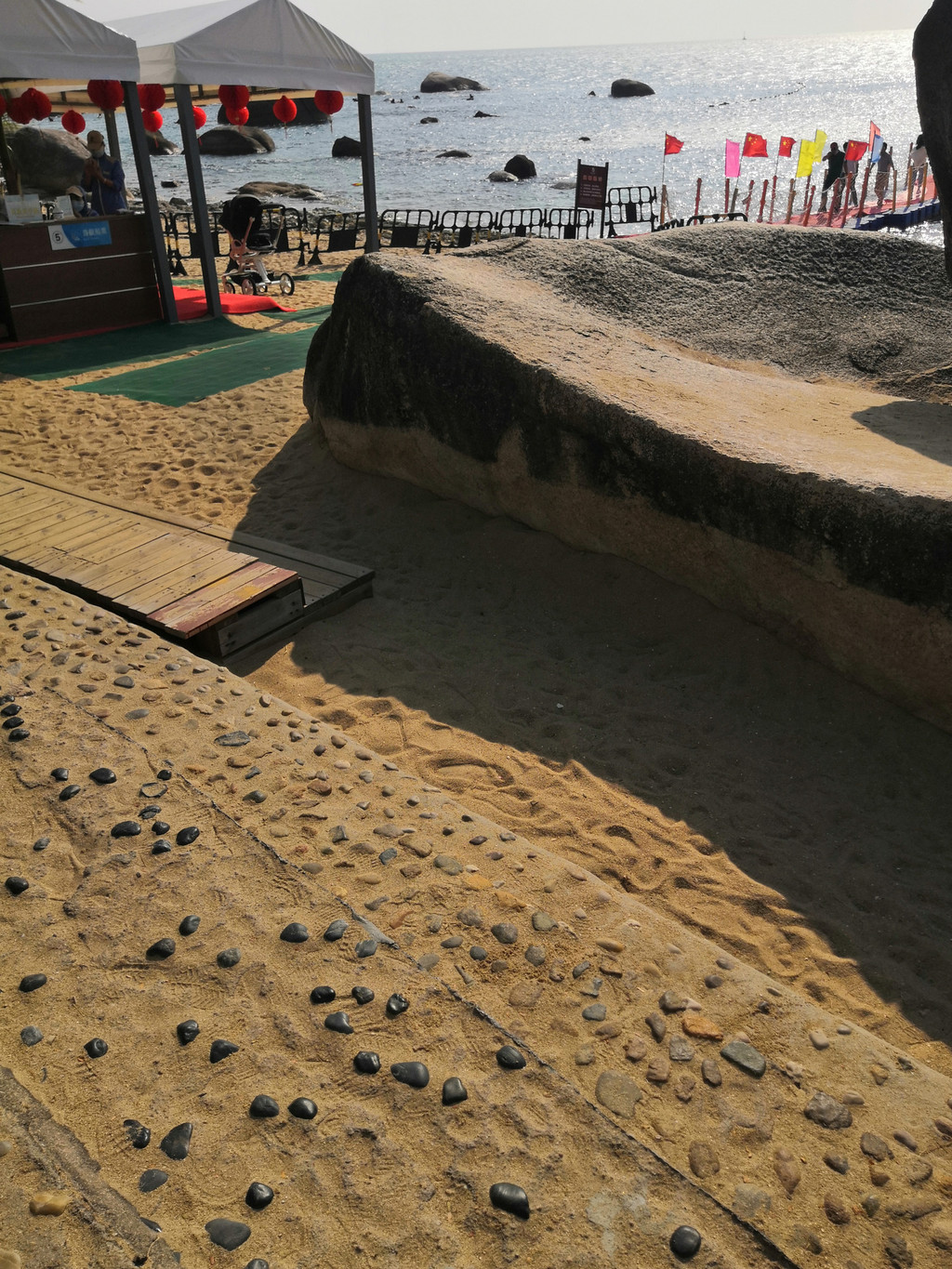 海角石藏在一大堆巨石之间,面朝外侧,如果不是一群人在此照相,还真容易错过。从海滩上走过去的路涨潮时会被淹没,得做好趟水的准备。