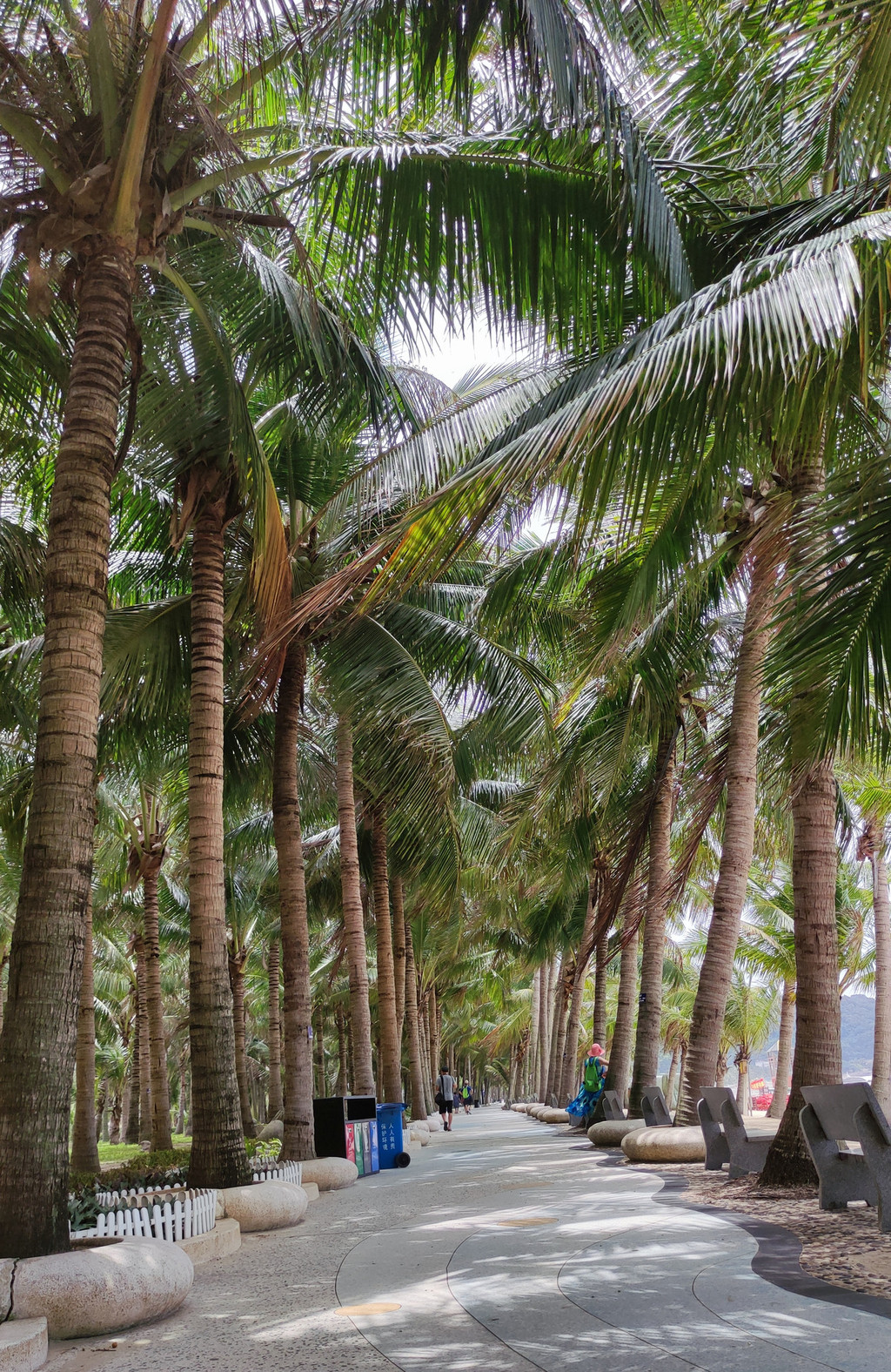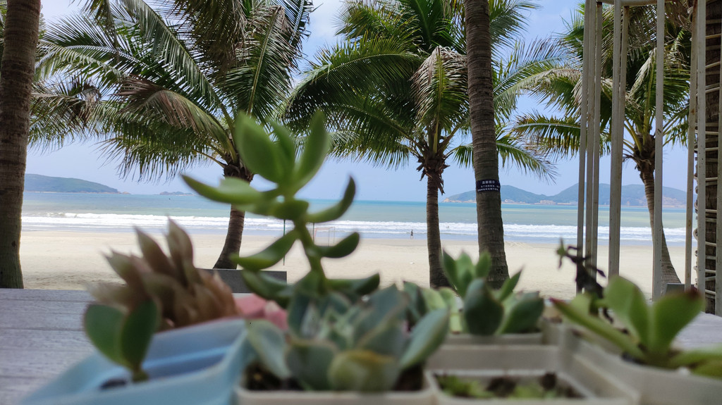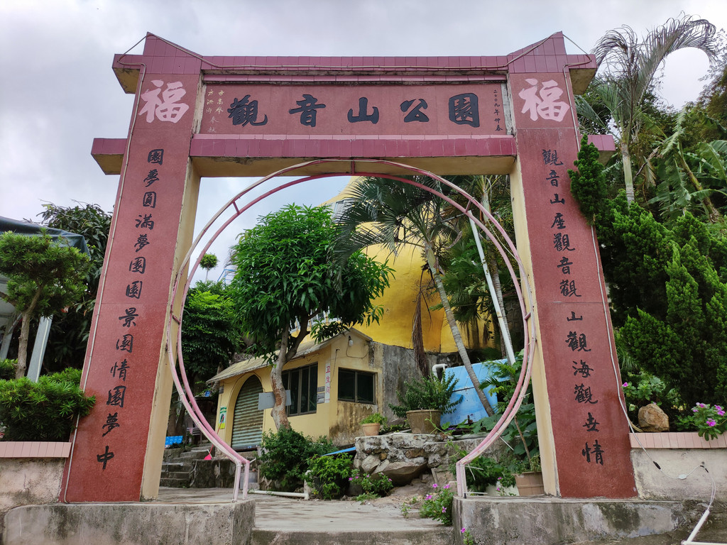 九点半,早餐之后,我们登上观音山,俯瞰整个下川岛王府洲旅游区,美不胜收,风光旖旎:阳光、大海、沙滩、椰林、小镇和谐美好,海边那片茂密的椰林深深吸引了我,炎炎夏日漫步椰林情人路,吹着海风、听着涛声、喝着新鲜、清甜的椰汁,好美的感觉,真想一直走下去。。。