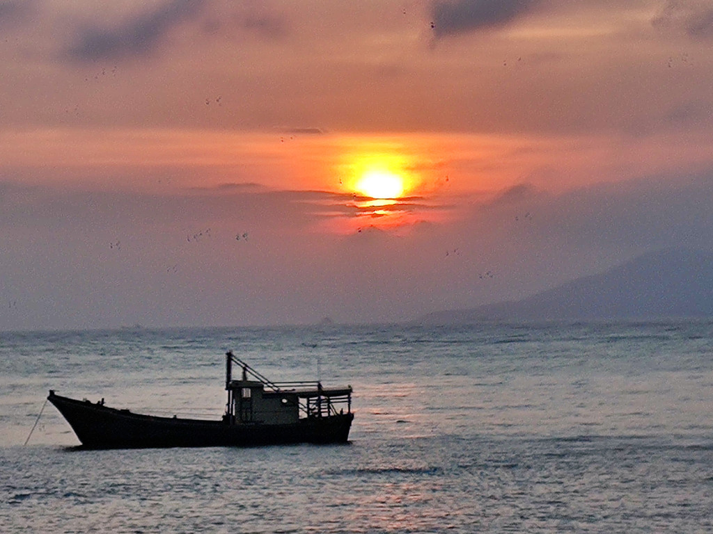 傍晚六点半我们坐东湾渔香酒家的免费接送车到距离王府洲5公里的东湾去观赏日落美景,绚烂的晚霞映红天际、宁静的渔港、美妙的涛声、生猛的海鲜陪伴着我们度过美好的夜晚。
