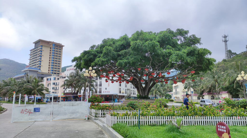 站在观音山顶俯瞰王府洲度假区:洁白的沙滩被椰林绿树环抱、半月形的海湾、柔软的沙滩、海风椰林、渔村落霞、美不胜收。