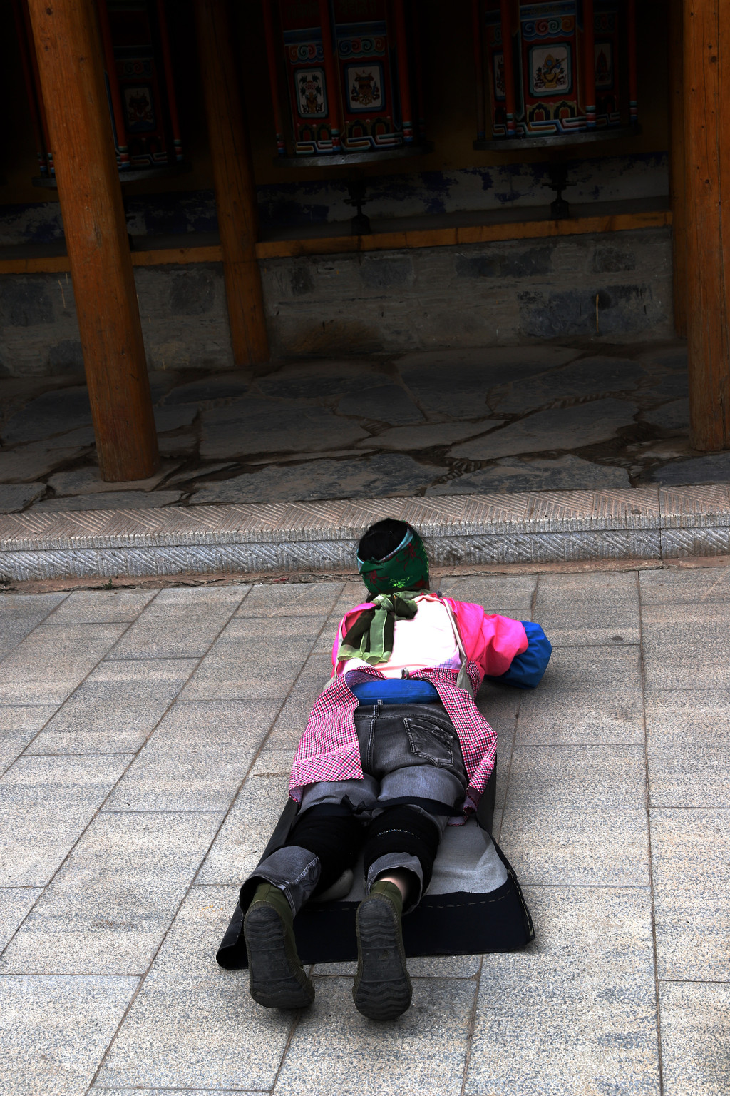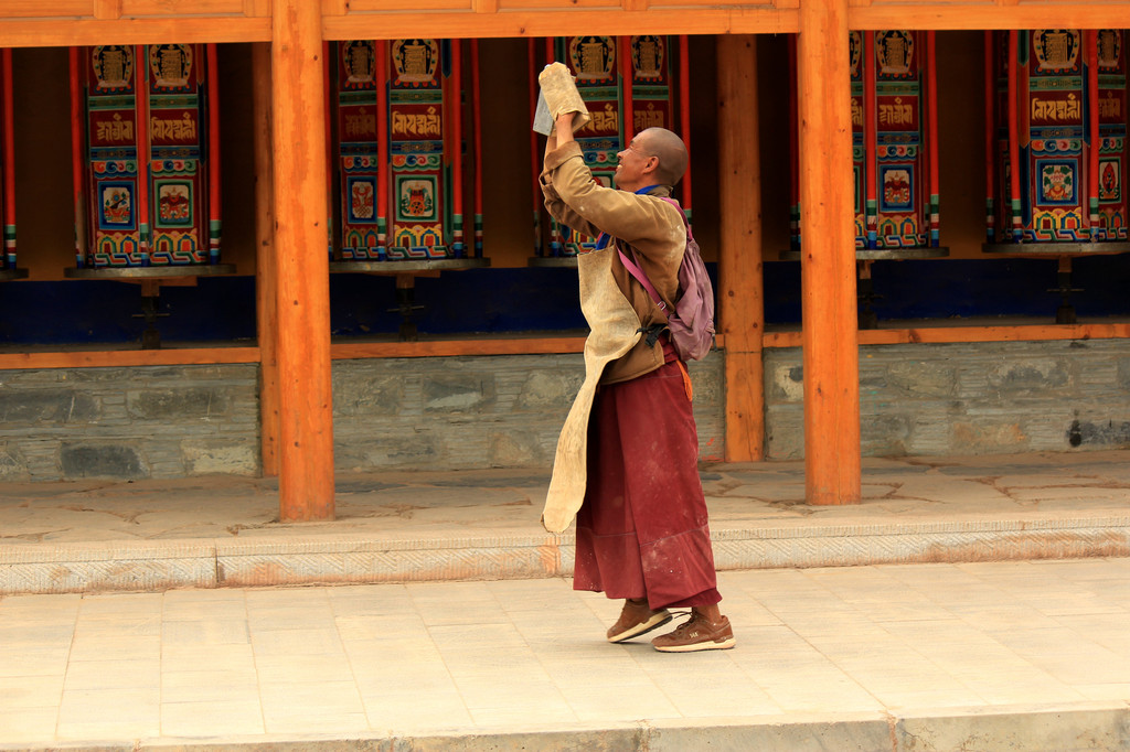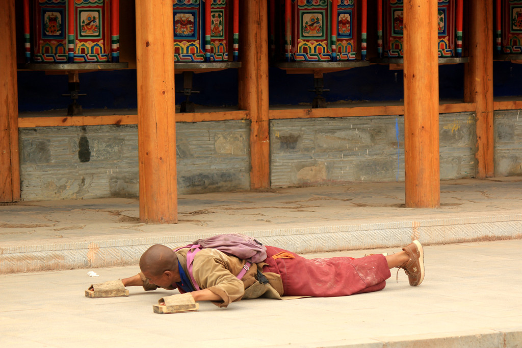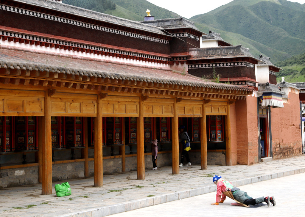 最虔诚的朝拜者是五体投地的信徒!他(她)们一拜一叩,用身体丈量着自己对信仰的诚心!我在拉卜楞寺看到了数个这样的朝拜者。信仰的力量是无穷的!在众多的朝拜者中,我看到不少白发苍苍、佝偻着身体、手拿佛珠,拄着拐杖的老夫老妇,他们步履珊珊地行走在朝拜的路上,只为那心中的信仰……